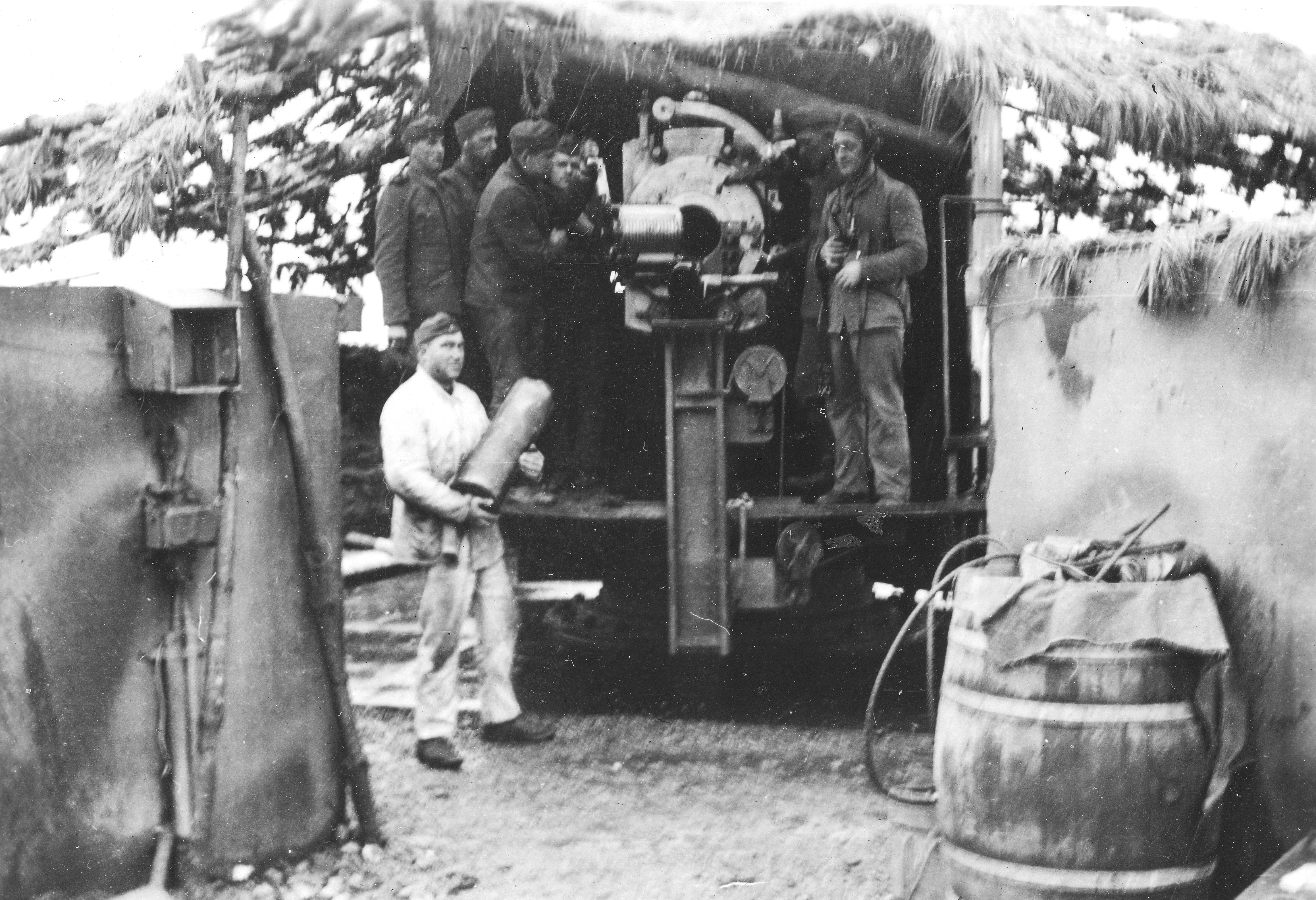 Vue du chargement de l'un des quatre canons de 164,7 mm avant la construction des casemates. La pièce d'artillerie est sommairement camouflée. Les artilleurs posent pour le photographe et regardent l'objectifImmatriculation