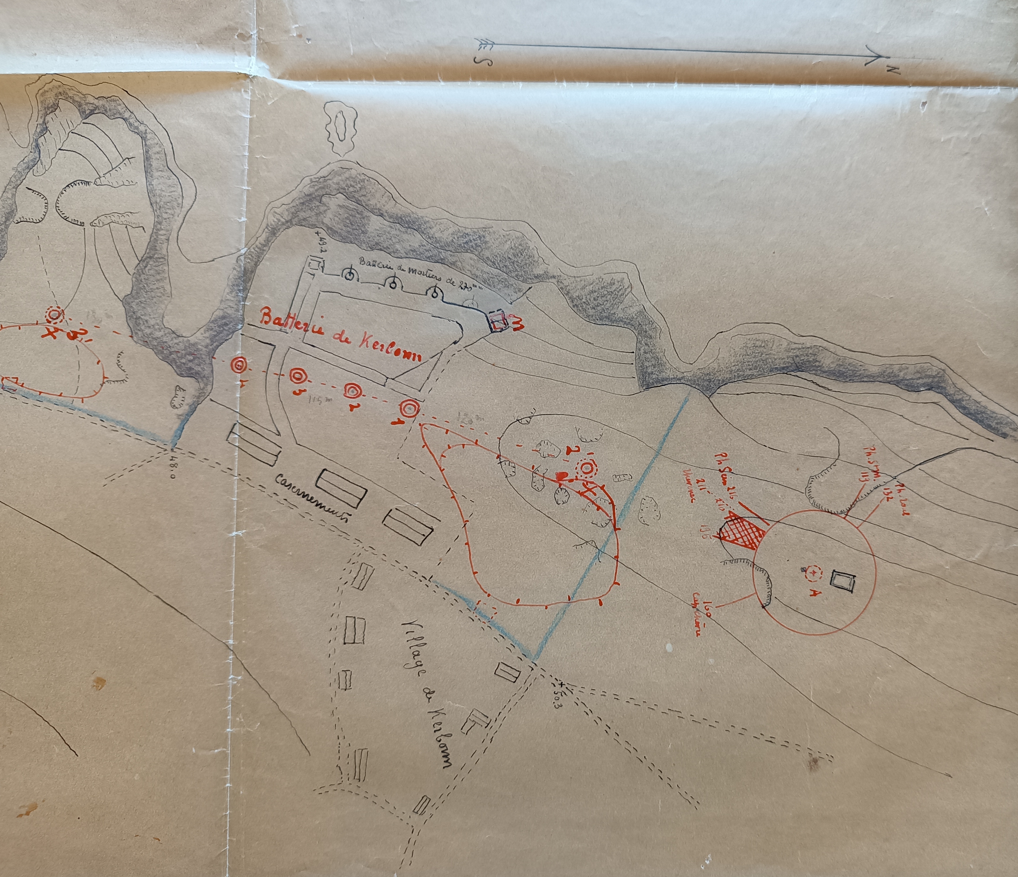 Extrait du plan de la pointe de Pen Hir à Camaret : représentation schématique des emplacements proposés pour la batterie de canon de 164 mm de Kerbonn, 1926. Les emplacements sont figurés par des cercles rougesImmatriculation