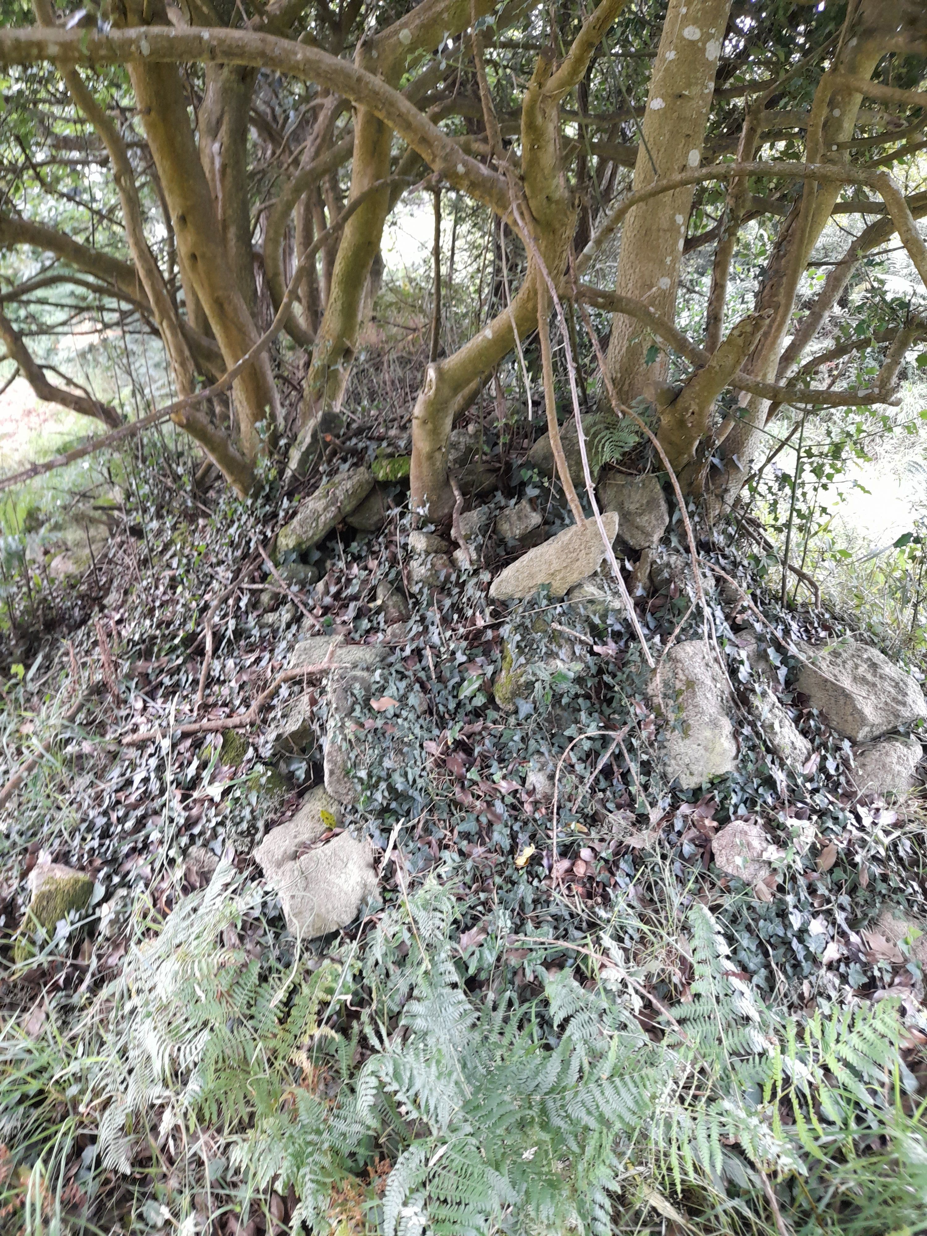 Mur 4, vue axiale vers l'est. Mur talus à parements en pierres planté d'arbres.Immatriculation