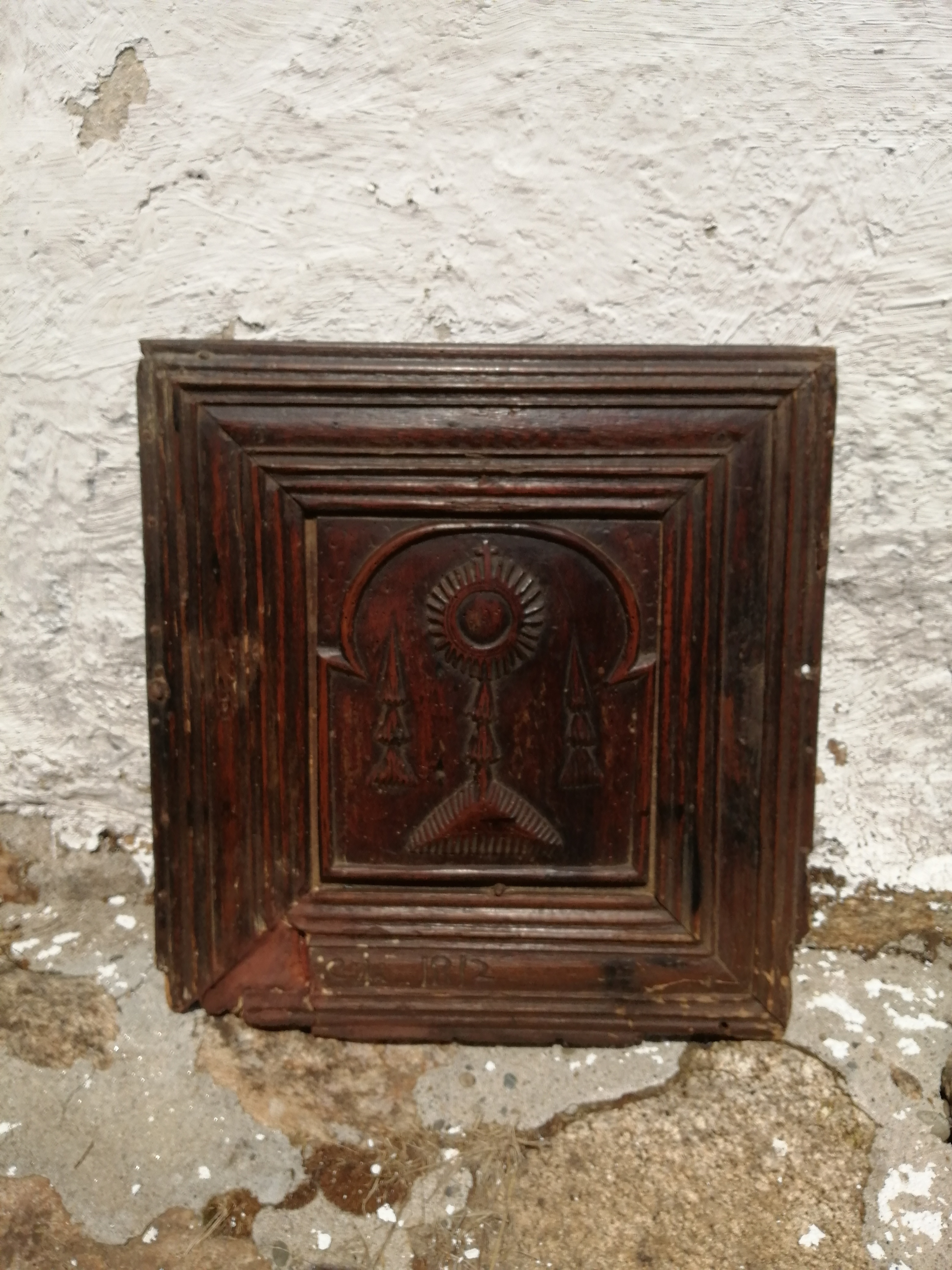 Drustuilh daté 1812, éléments. Détail porte gauche, ostensoir, bougies et inscription : C : I : 1812.Immatriculation