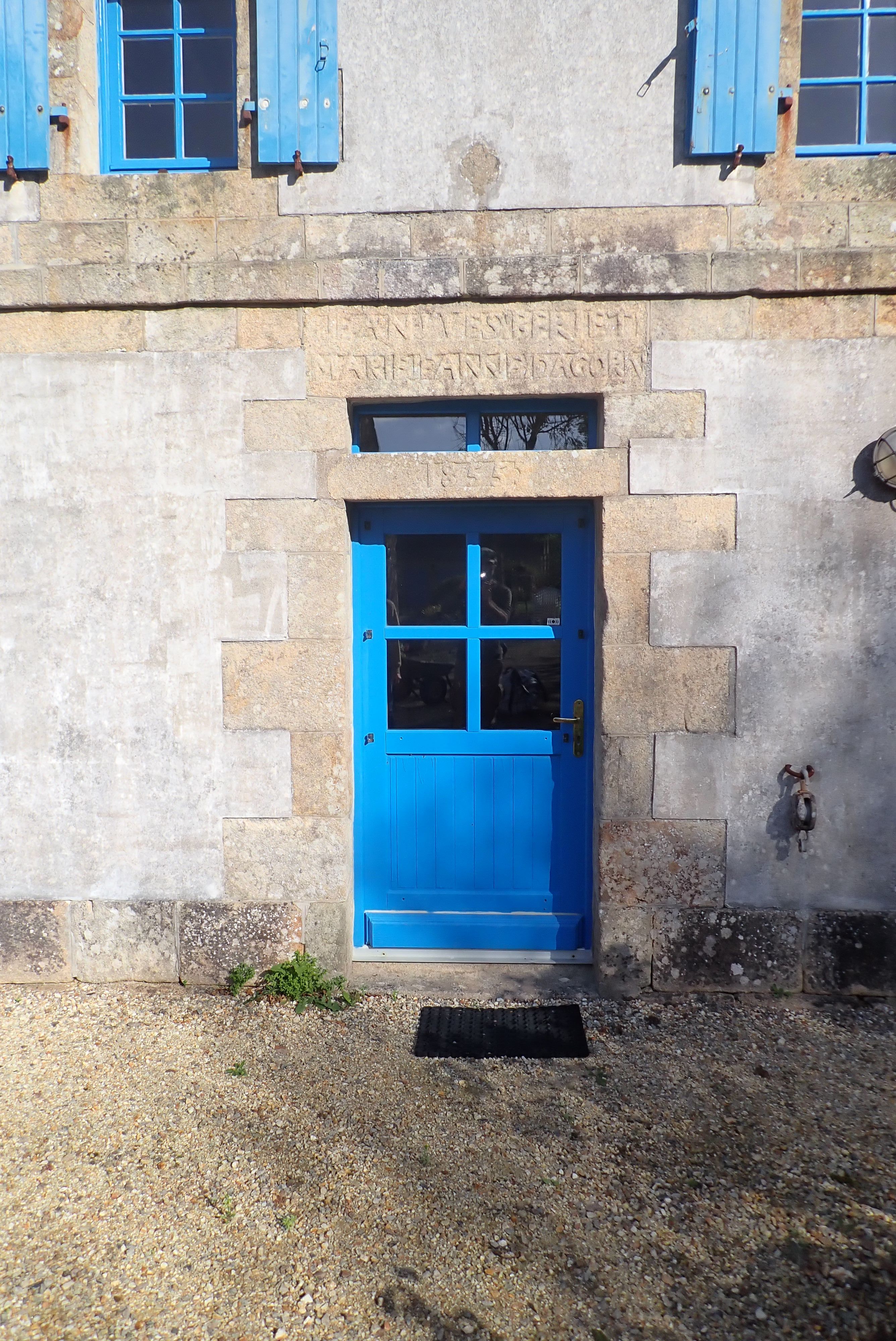 Logis daté 1855, détail de la porte et inscription : JEAN YVES : BERIET / MARIE JEANNE : DAGORN. (2023)Immatriculation