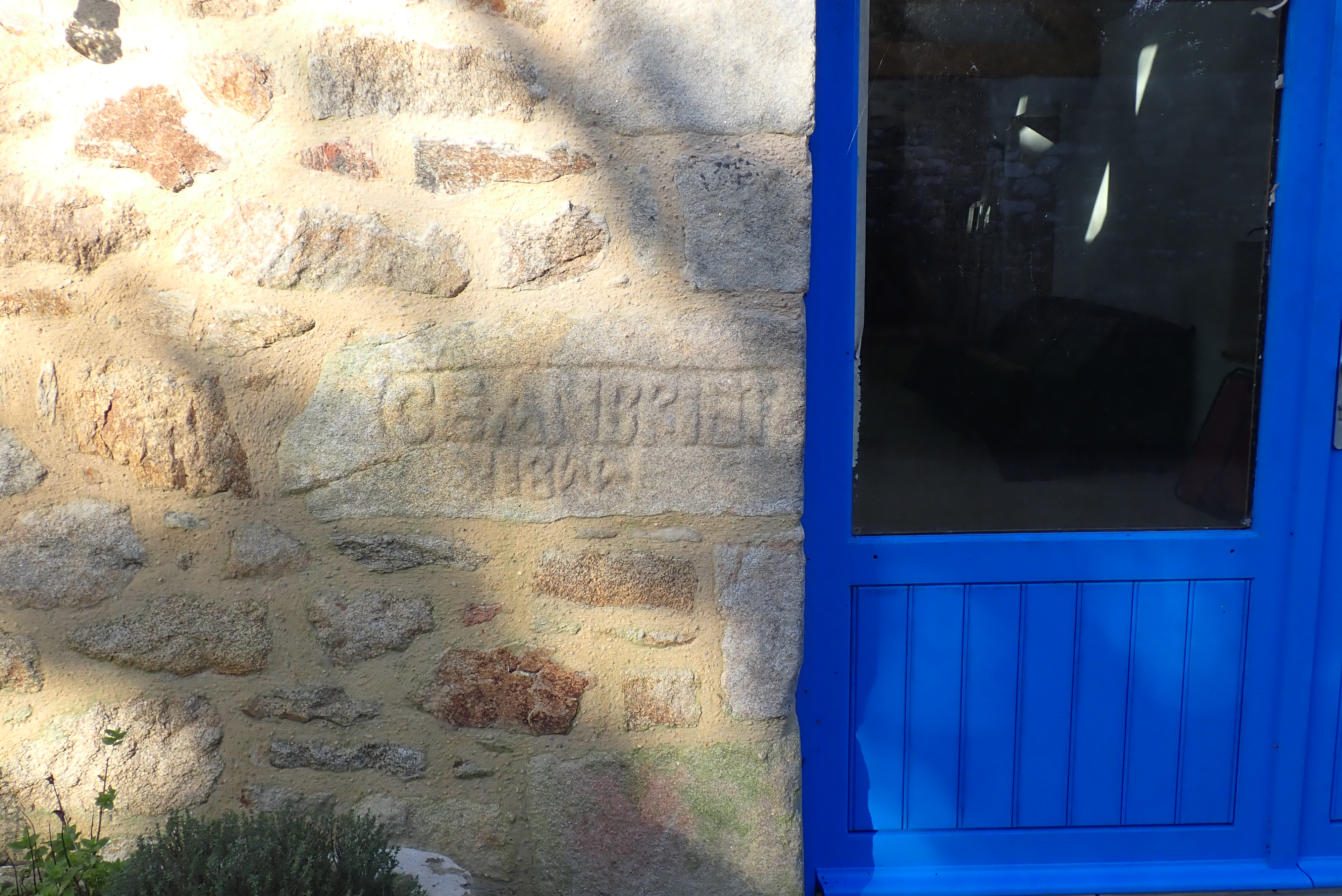Grange, détail d'une pierre en réemploi. Inscription : GEAN BRIET / 1844.Immatriculation