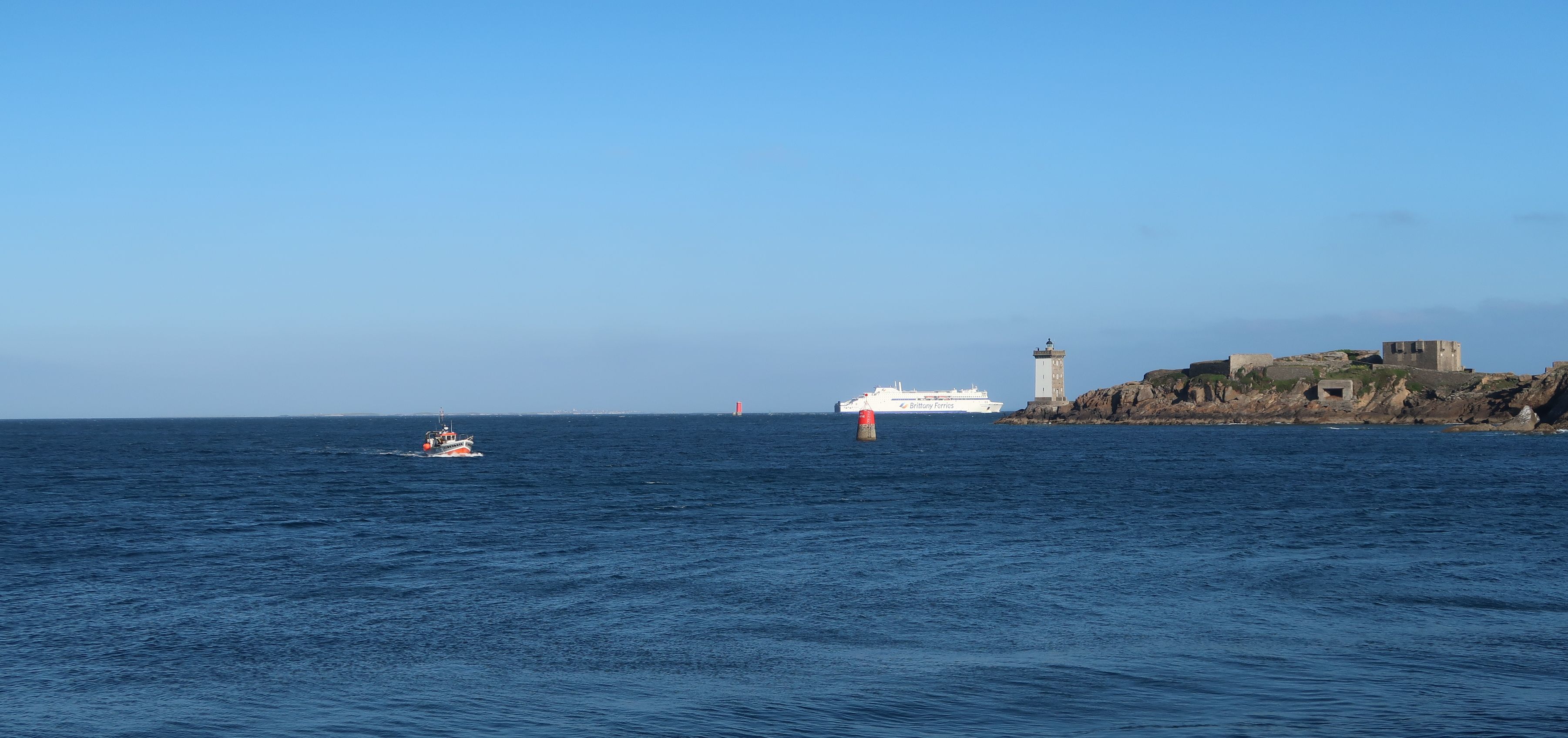 Paysage maritime depuis Le Conquet : bateau de pêche, ferry, phare de Kermorvan, site défensif de Kermorvan et tourellesImmatriculation