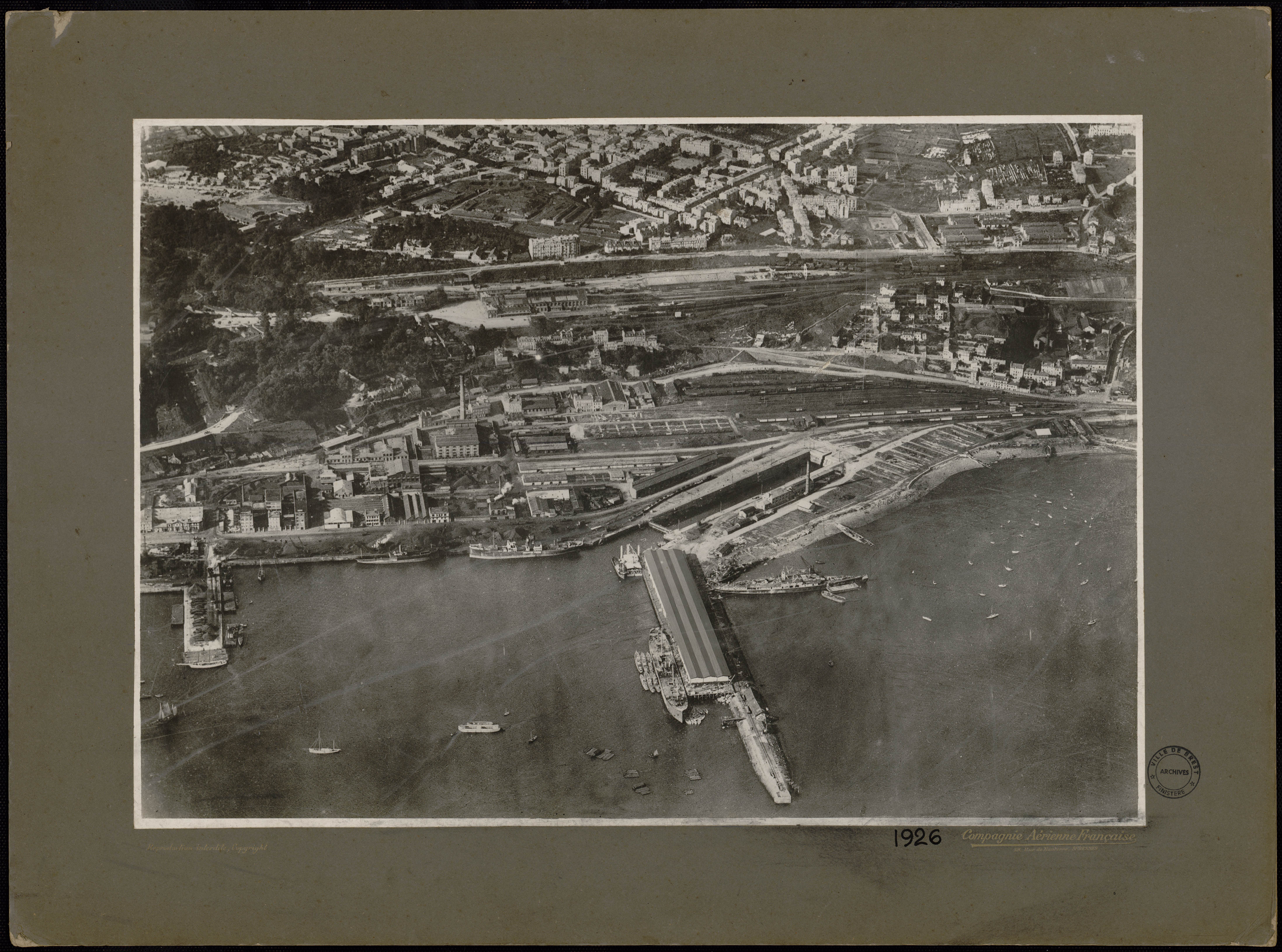 Vue aérienne du 5e bassin, de la forme de radoub, des quartiers du Merle Blanc et de la gare (1926)Immatriculation