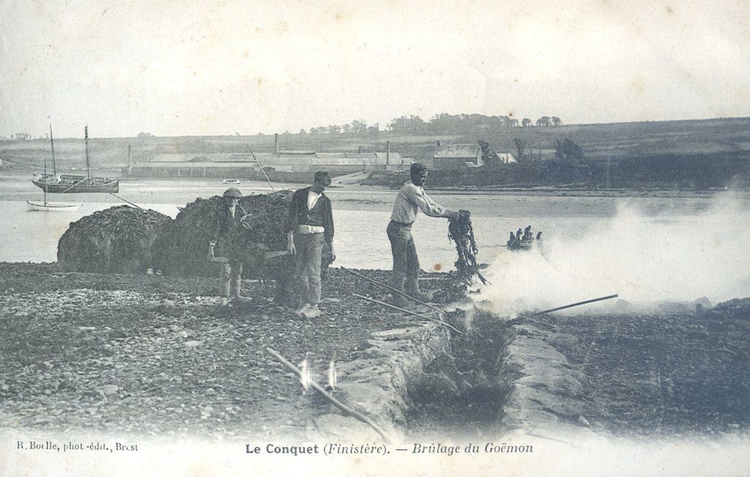 Carte postale, Le Conquet, Brûlage de goëmon, R. Boelle, photographe éditeur Brest (même photo que la précédente carte postale mais inversée)Immatriculation