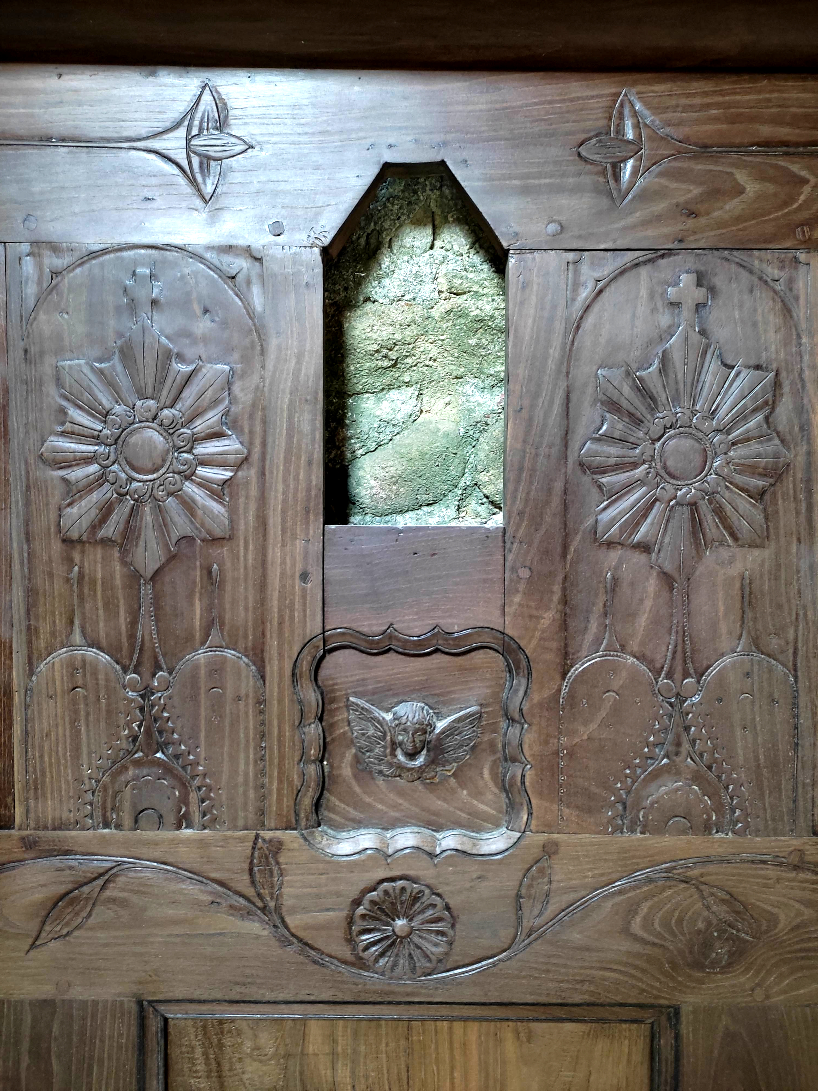 Cléden-Cap-Sizun, drustuilh non daté (vers 1900), détail des décors centraux : ostensoirs, niche à Vierge et "rosace" avec tête d'angelot. (2023)Immatriculation