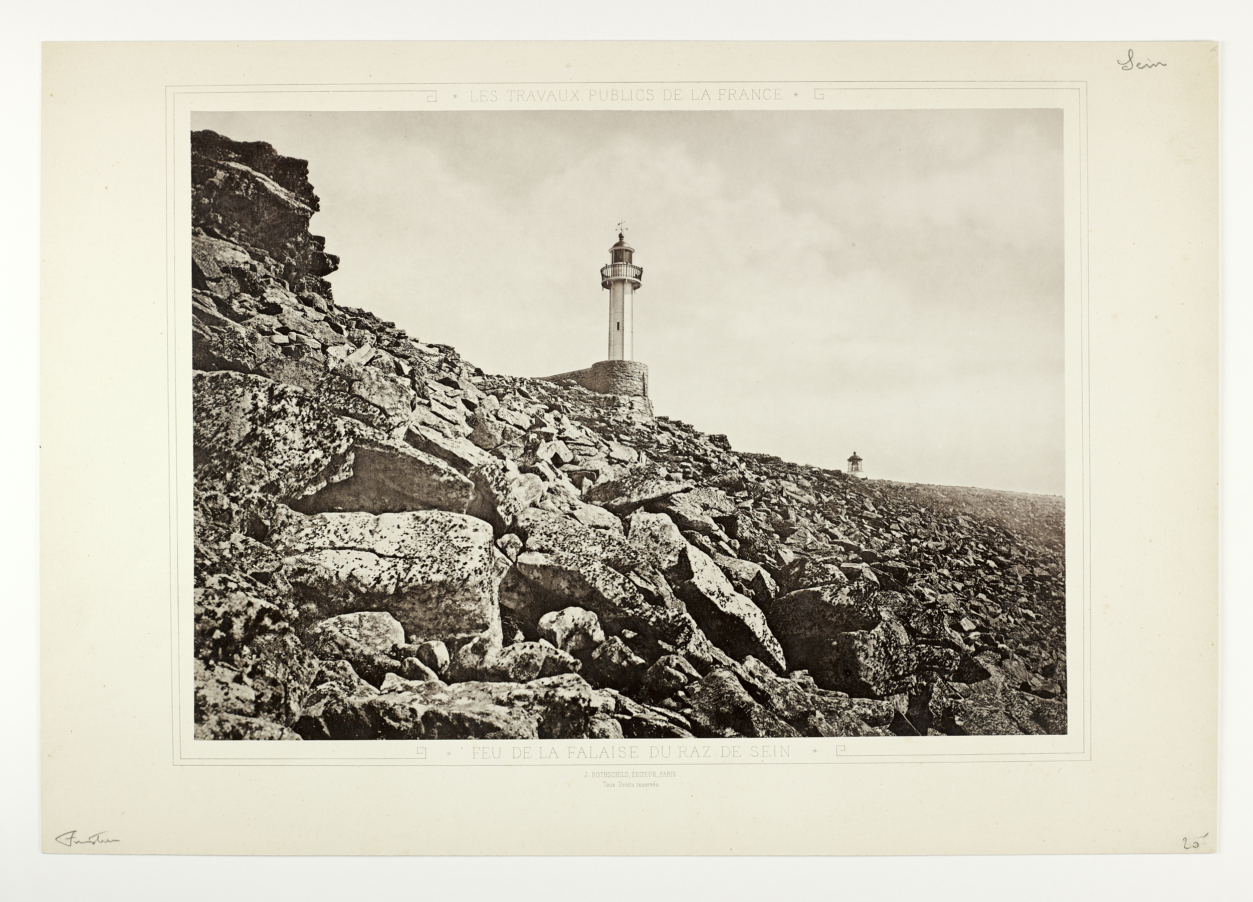 Feu de la falaise du Raz et en arrière plan, la lentille du phare de la pointe du Raz. Reproduction planche phototypée. ; 1870 - 1890 ; Paris.Immatriculation
