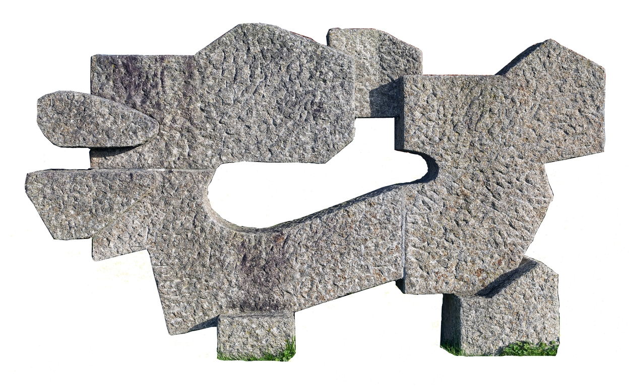 Sculpture en granite de Francis Pellerin, 1979. Photographie détourée.Immatriculation
