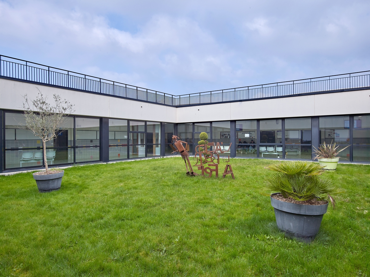 Vue d'ensemble du patio entre les ateliers et le l'externat (bâtiment D) et de sa sculpture métallique.Immatriculation
