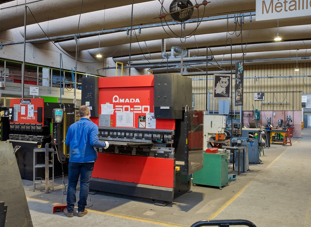 Vue intérieure des ateliers : machine presse - plieuse.Immatriculation