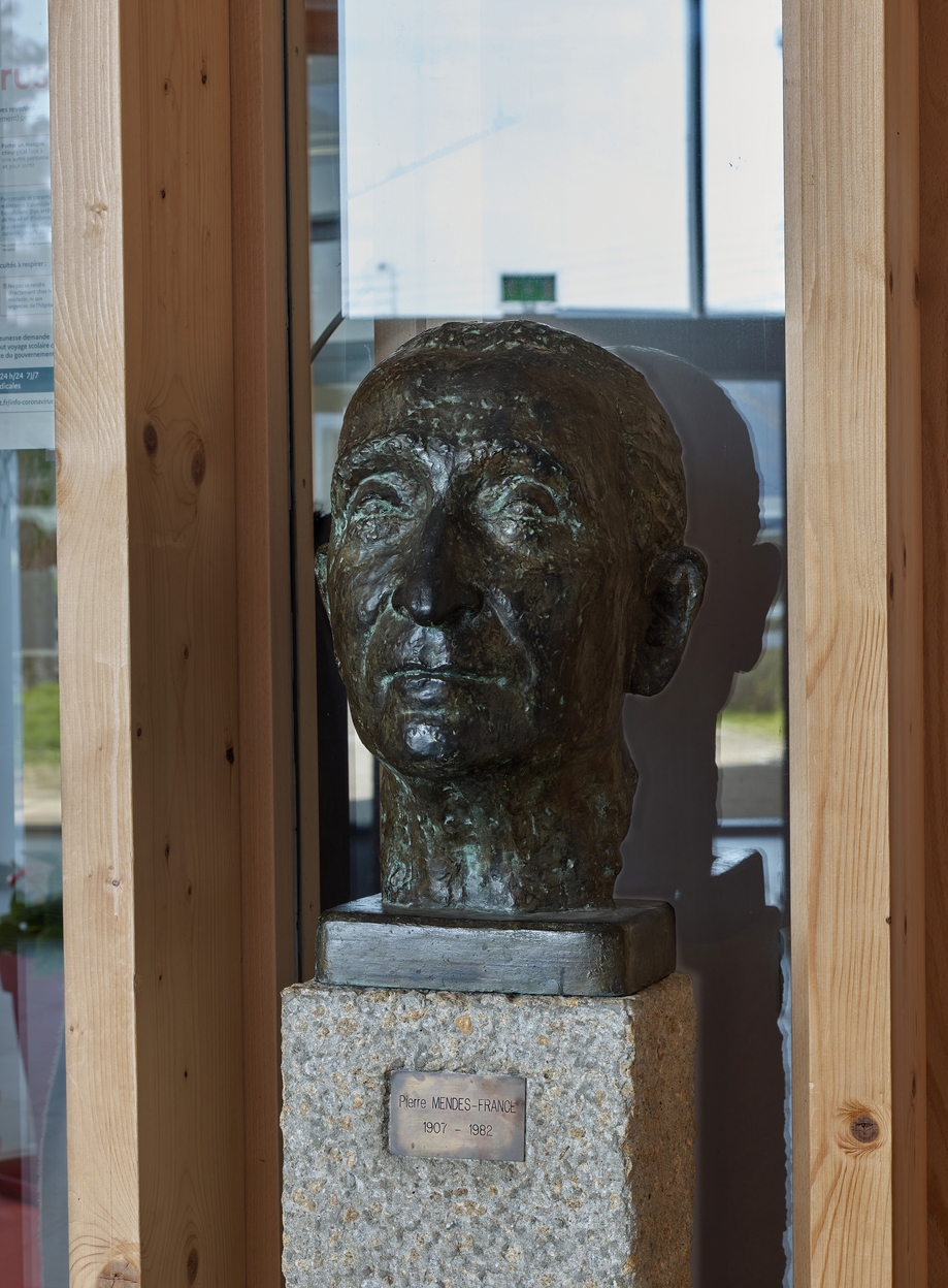 Sculpture en bronze représentant Pierre Mendès-France (dans le hall d'accueil).Immatriculation