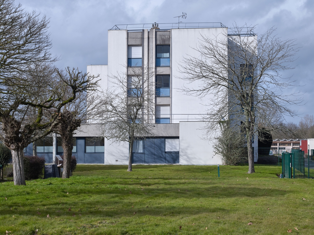 Infirmerie et internat, façade sud. Roger Besnard, architecte, 1973. Noter la composition : jeu de niveaux, décalage des deux ailes de l'internatImmatriculation