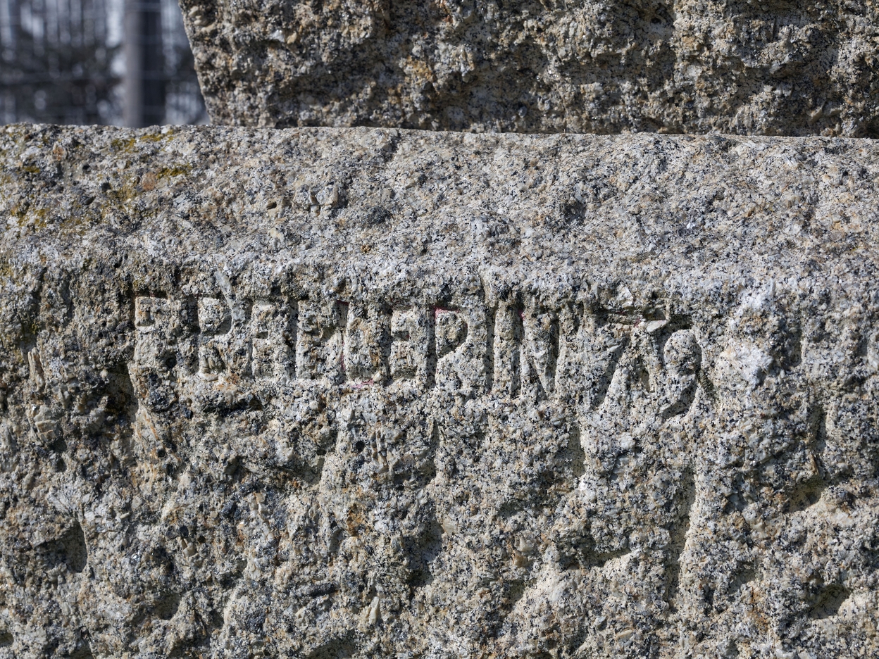 Sculpture en granite de Francis Pellerin, 1979 : détail sur la signature et la date.Immatriculation