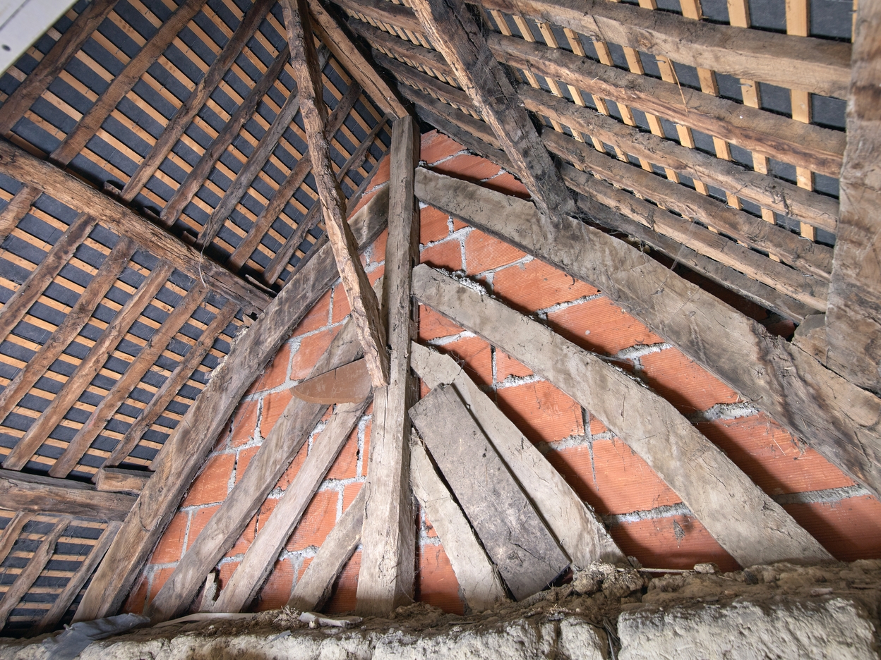 Au dessus du mur de refend qui sépare les deux parties de l'édifice, pignon en pan de boisImmatriculation