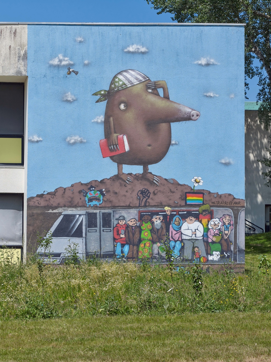 Fresque du graffeur ADOR, réalisée avec la participation des élèves du 'club arts' du lycée. 16-18 juin 2021.Immatriculation