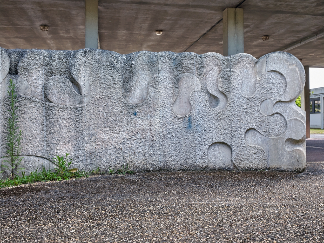 Sculpture "Coupe-Vent" de Yazuo Mizui (1976), en pierre de Vassens : vue partielle de l'un des deux murs.Immatriculation