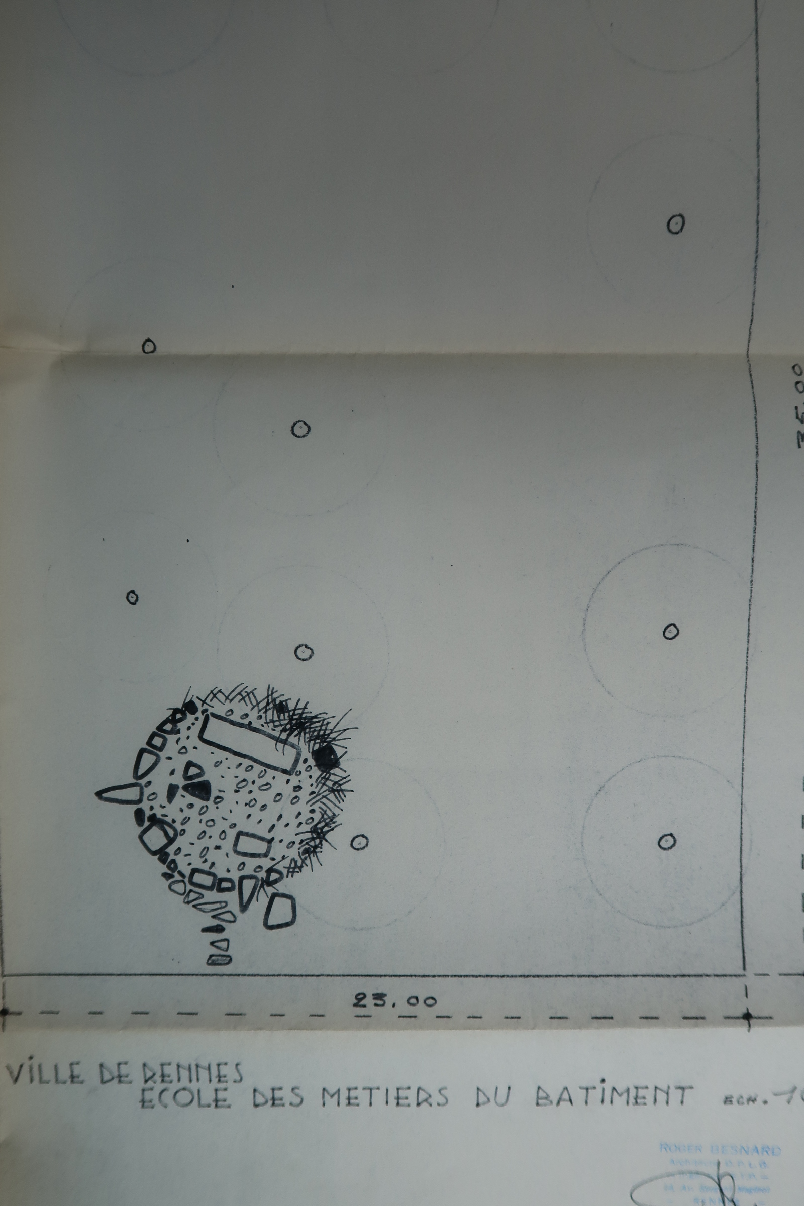 Schéma d'implantation de la sculpture de Francis Pellerin transmis par l'architecte Roger Besnard, à la Commission nationale.Immatriculation