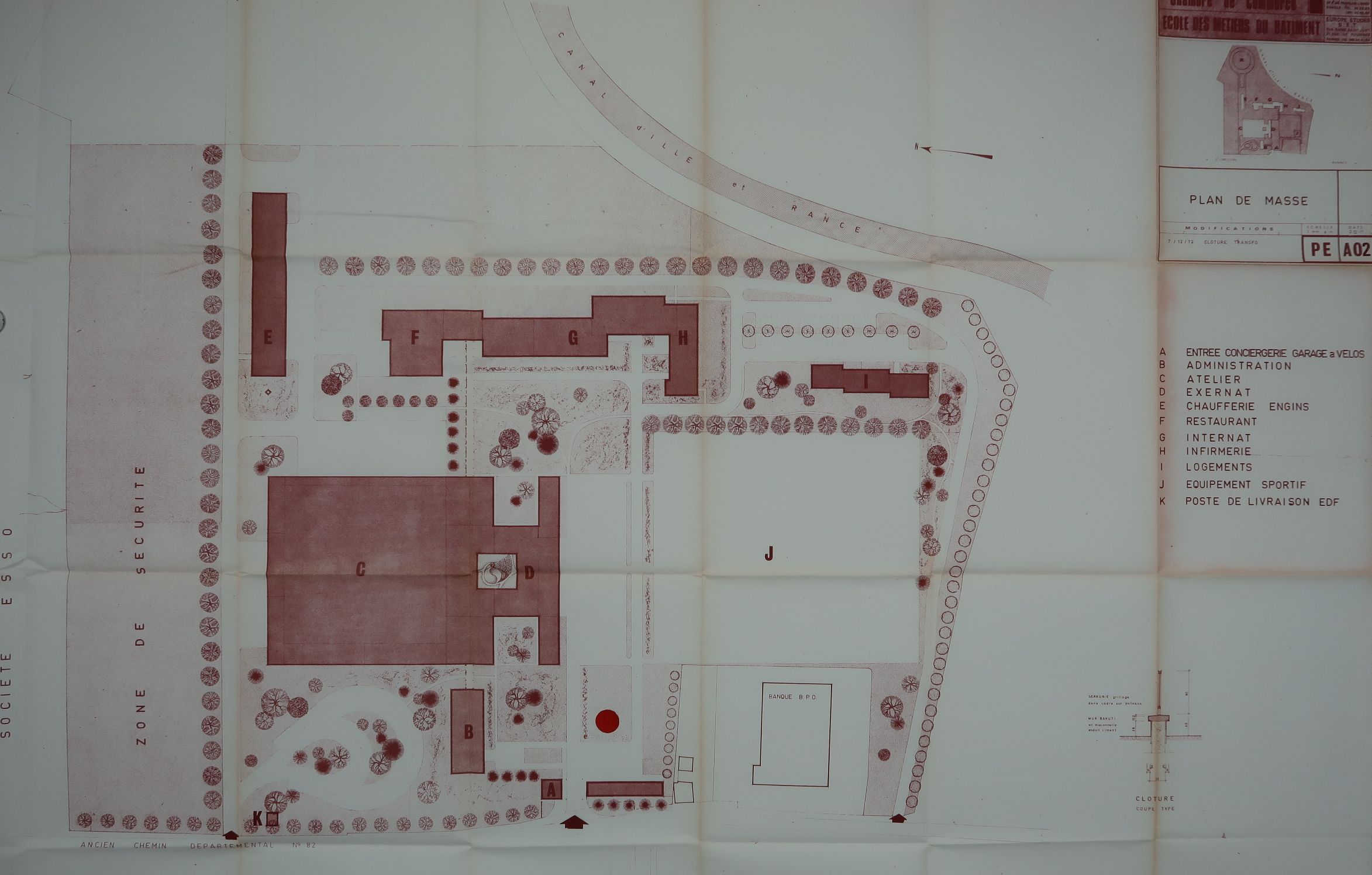 Plan de masse de l'école des métiers du bâtiment, avec implantation de l'œuvre (rond rouge). Roger Besnard, architecte, 7/12/1972.Immatriculation
