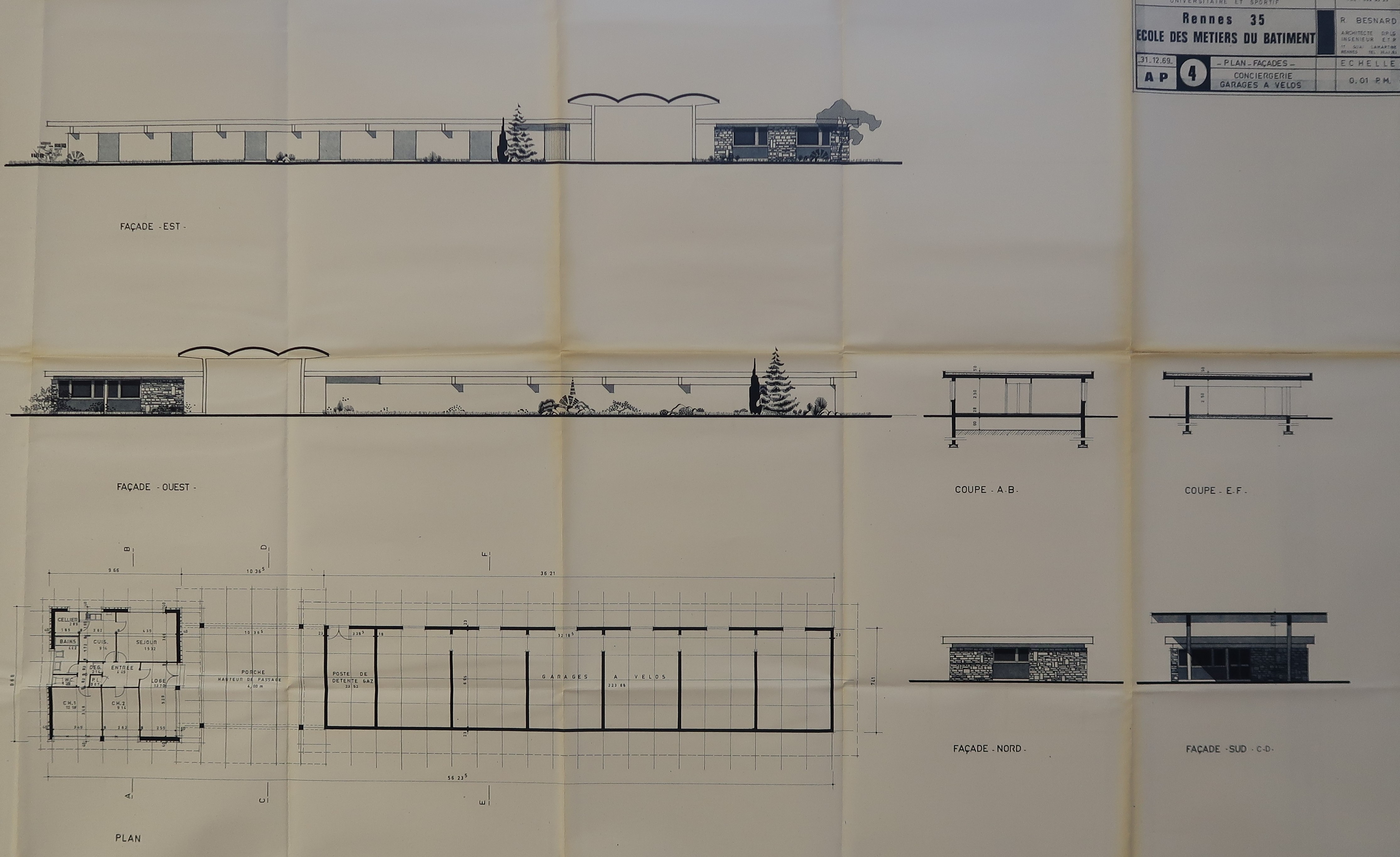 Plan et façades "Conciergerie - garage à vélos". Roger Besnard, architecte, 1969. Ces bâtiments ont été détruits vers 2020.Immatriculation