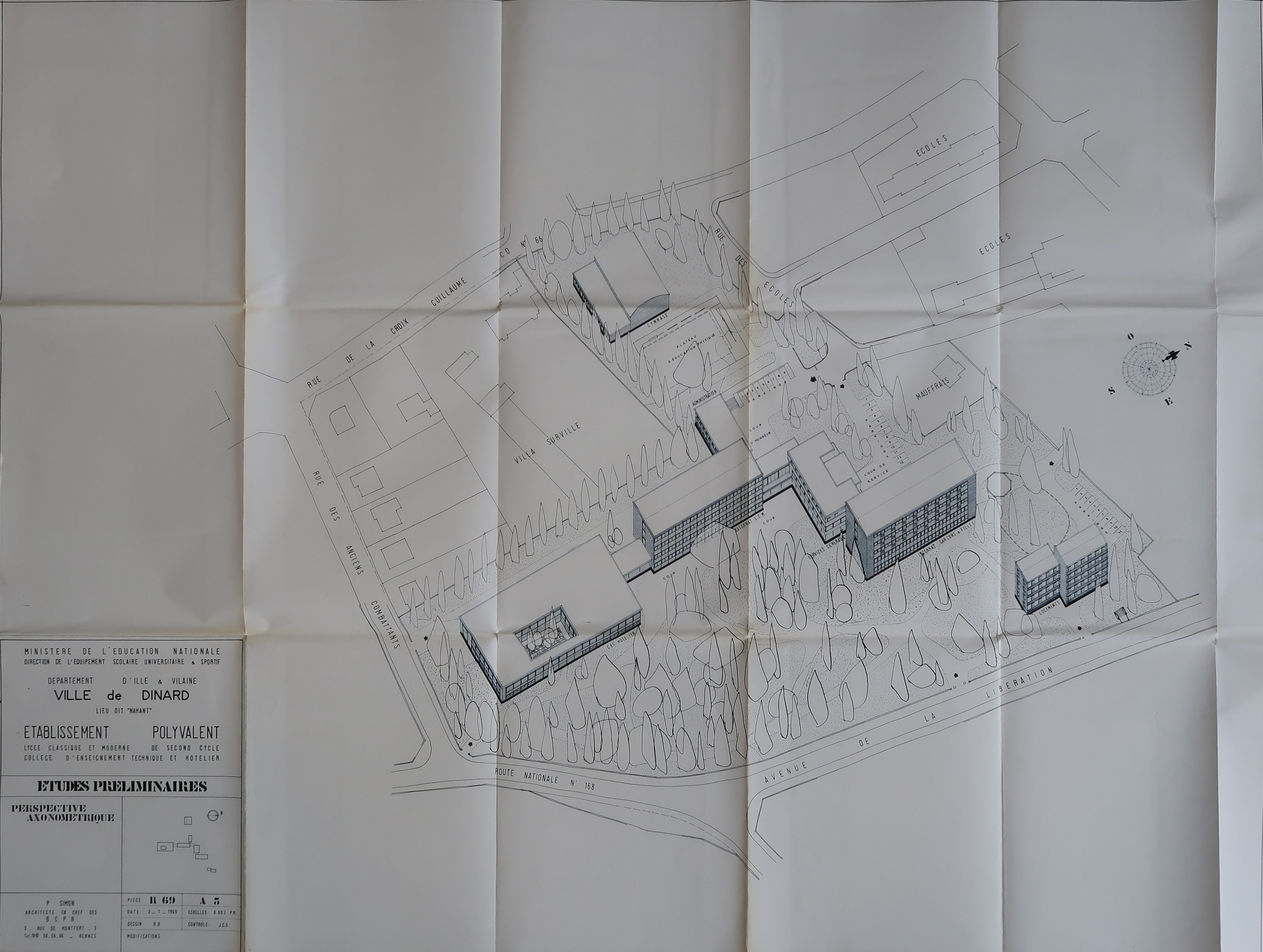 Archives municipales de Dinard : 4 M 11. Simon [P.], Lycée et CET hôtelier de Dinard. Perspective axonométrique et Plan de masse, 25 septembre 1970