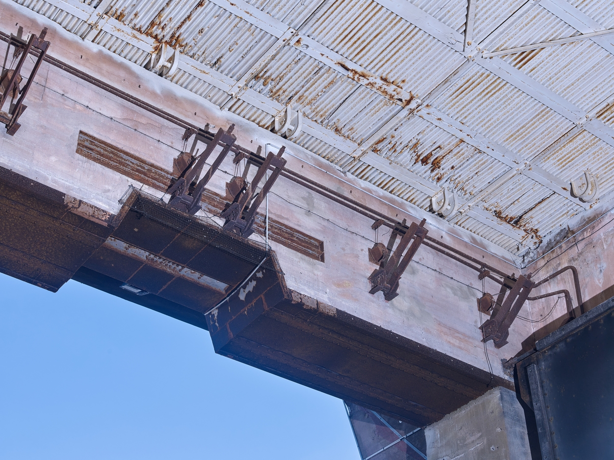 Vue du système de verrouillage de la porte blindée nord de l'alvéole du slipway. En position ouvert, chaque élément de fermeture était relevé par un treuil à manivelle. L’encoche témoigne de la nécessité d’accueillir des sous-marins de plus en plus hautsImmatriculation