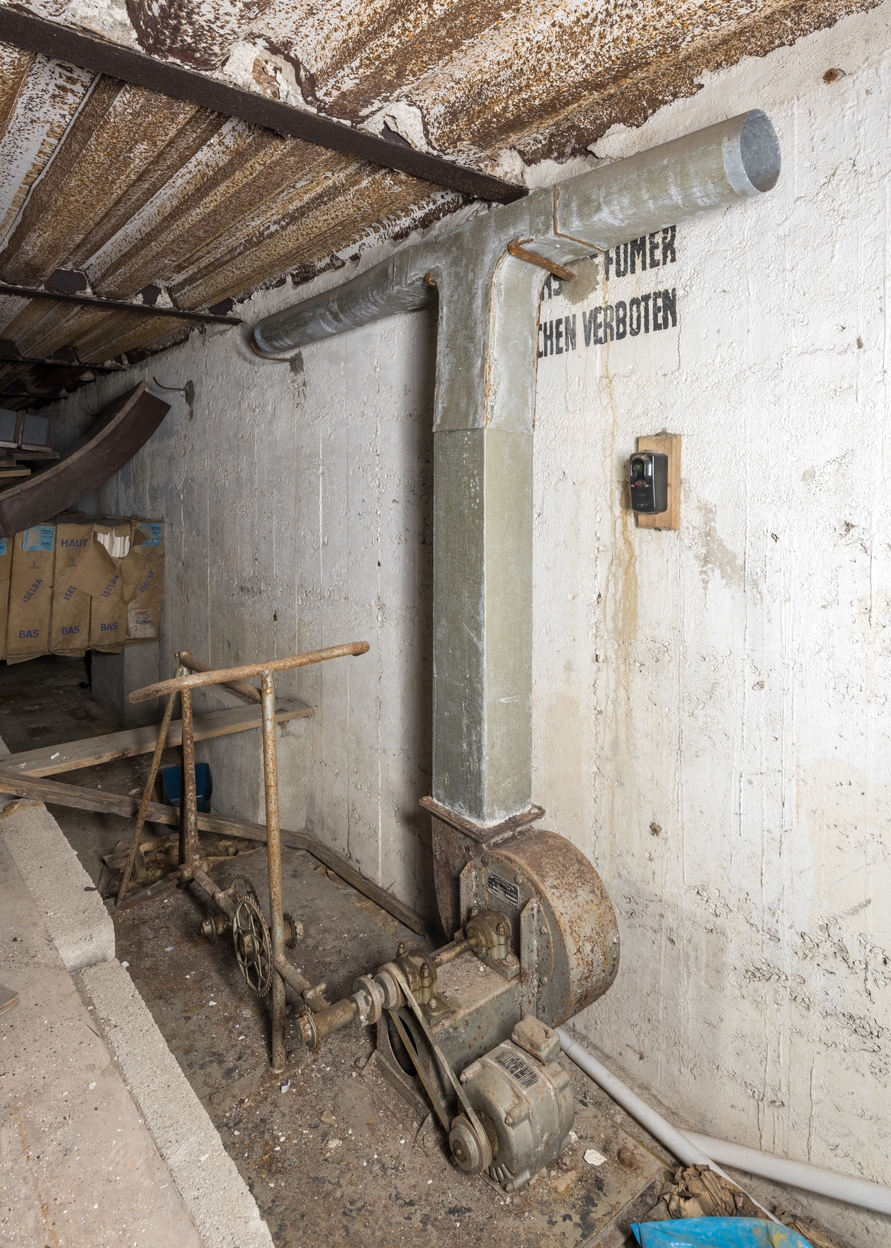 Vue du système de ventilation et d'éclairage électrique via le pédalier d'un vélocipède fixé au sol de la salle 2 (la selle et les chaînes ont disparu). L'électricité est produite par un générateur via une courroie de transmissionImmatriculation