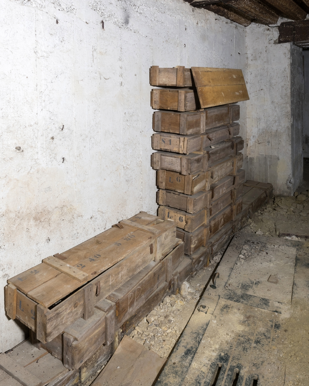Vue d'anciennes caisses à munitions en bois dans la salle 2. Elles servent à stocker des carottes de sondageImmatriculation