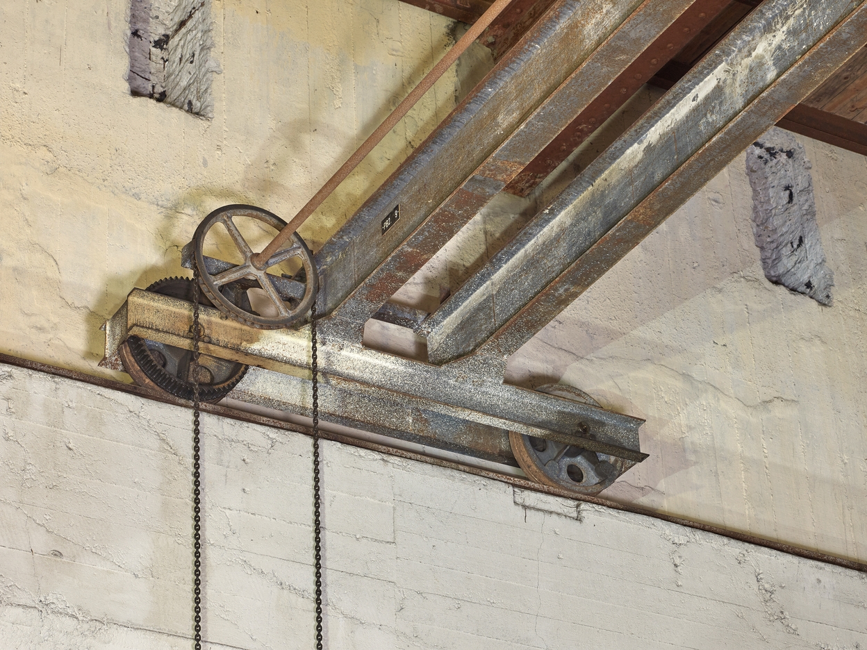 Vue de détail de l'un des deux ponts roulants bipoutres. La chaîne continue permet le déplacement longitudinal du pont roulant (le système est identique à l'opposé mais il a perdu sa chaîne)Immatriculation