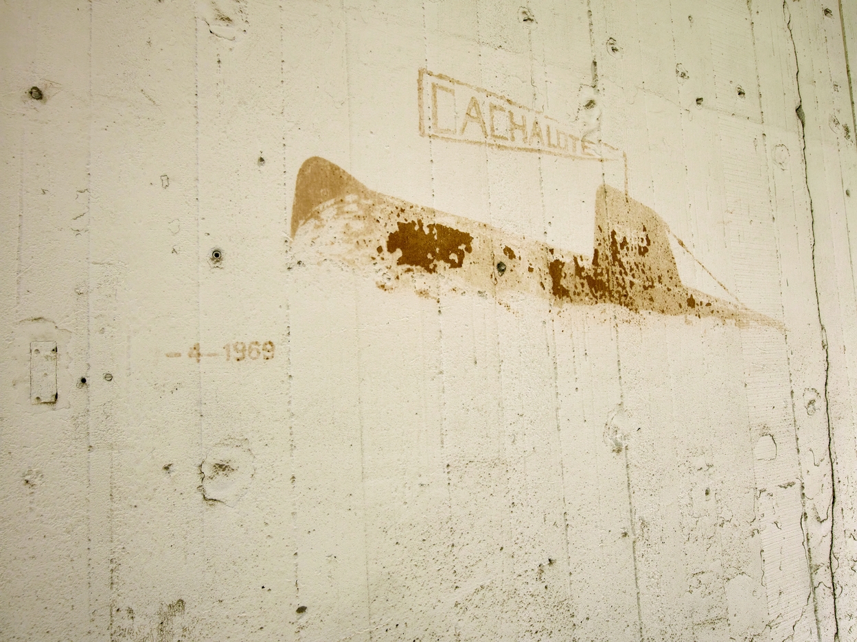 Vue de l'une des peintures murales d'origine française de la nef n° 1 : représentation du sous-marin "Cachalote", immatriculé "S165" avec la date d'avril 1969 (passerelle ouest). La nef abrite le chantier naval Marsaudon CompositesImmatriculation
