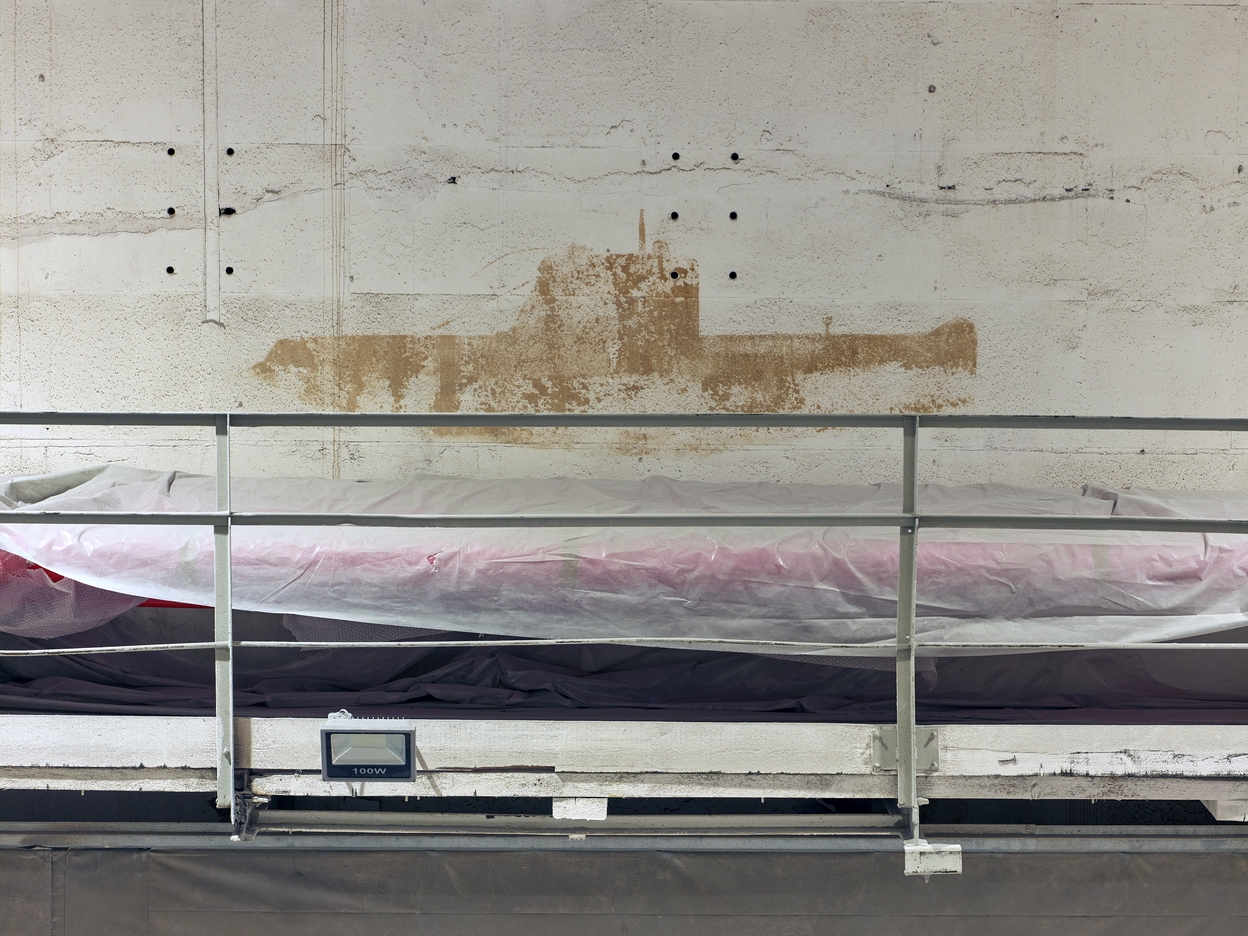 Vue de l'une des peintures murales d'origine française de la nef n° 1 : représentation d'un sous-marin de type "Daphné" (passerelle est). La nef abrite le chantier naval Marsaudon CompositesImmatriculation