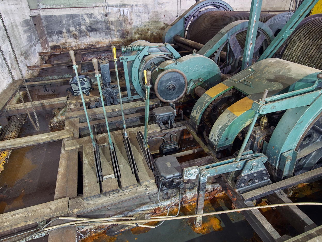 Salle du treuil du slipway du bunker "KI" avec son treuil de hissage (Lorient),