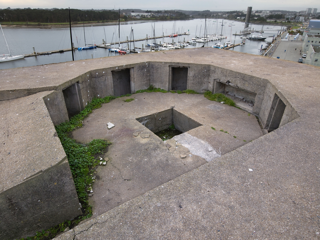Vue du bunker du double encuvement antiaérien situé sur la dalle de couverture : encuvement ouest. Au centre, l'emplacement pour le canon. Tout autour, petits abris pour les canonniers et niches à munitions. En arrière-plan, le Port de la BaseImmatriculation