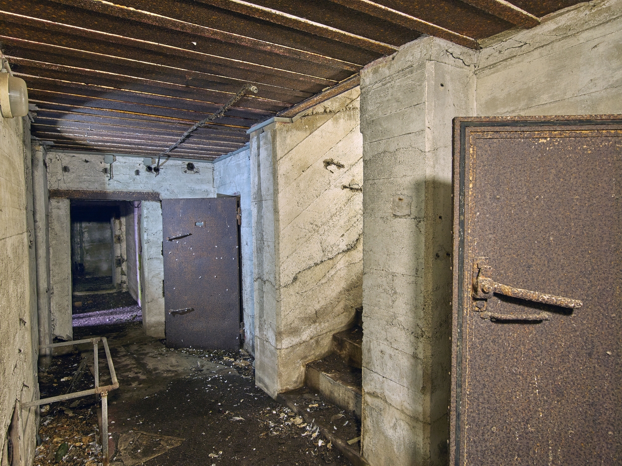 Vue du bunker du double encuvement antiaérien situé sur la dalle de couverture : sas ; les pièces de vie / chambrées sont dotées de leurs portes étanches. A droite, accès à l'escalier menant aux encuvementsImmatriculation
