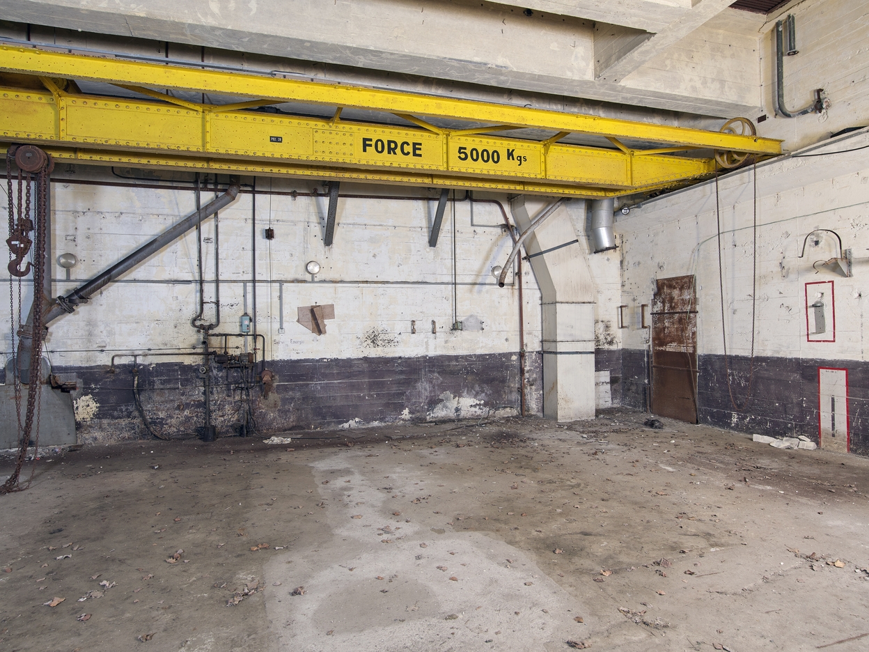 Locaux techniques, partie nord, rez-de-chaussée, grande pièce de la centrale électrique : pont roulant manuel d'une capacité de 5 tonnes et son treuil. Sur les murs bicolores, sont fixés des systèmes de tuyauterie et une gaine de ventilationImmatriculation