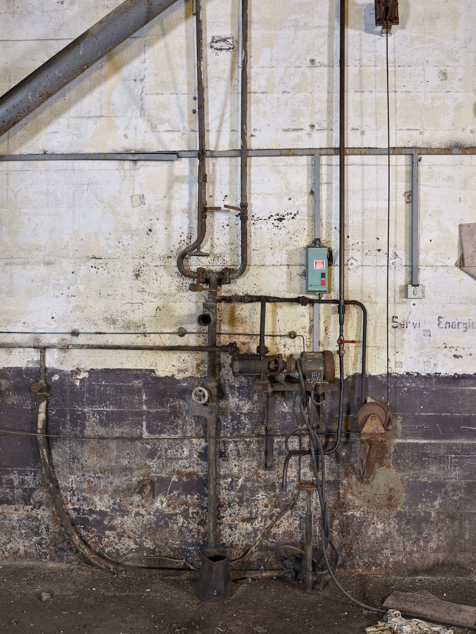 Locaux techniques, partie nord, rez-de-chaussée, grande pièce de la centrale électrique : sur les murs bicolores sont fixés des systèmes de tuyauterie, ici, une pompe électrique. Un treuil à câble permet d’actionner deux vannesImmatriculation