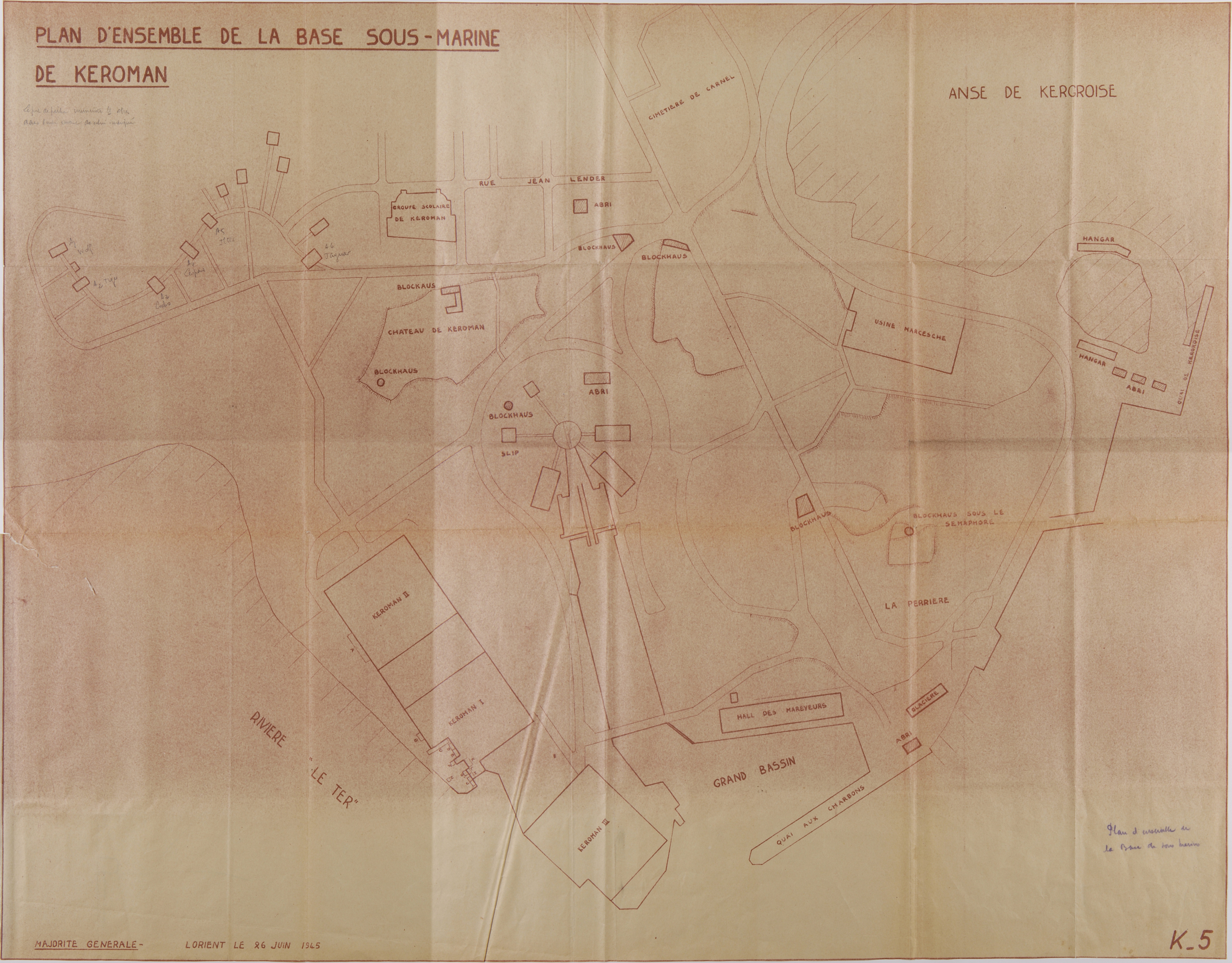 Plan d'ensemble de la base de sous-marins de Keroman, plan K n° 5, 26 juin 1945 (Service Historique de la Défense de Lorient, Monographie de la base "Ingénieur Général Stosskopf", 1945-1946)Immatriculation