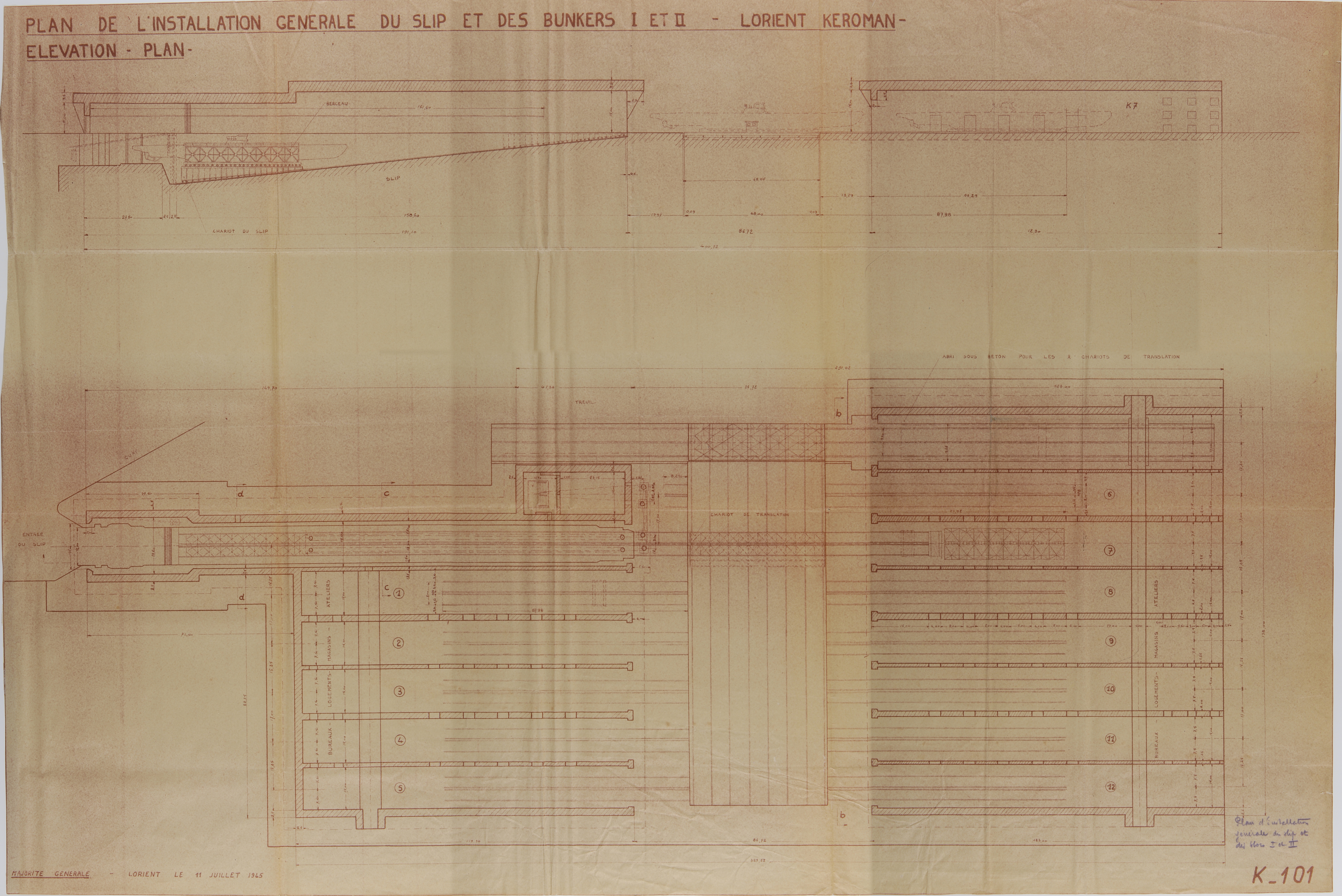 Plan d'ensemble et coupe des bunkers "KI" (avec le slipway) et "KII", plan K n° 101, 11 juillet 1945 (Service Historique de la Défense de Lorient, Monographie de la base "Ingénieur Général Stosskopf", 1945-1946)Immatriculation