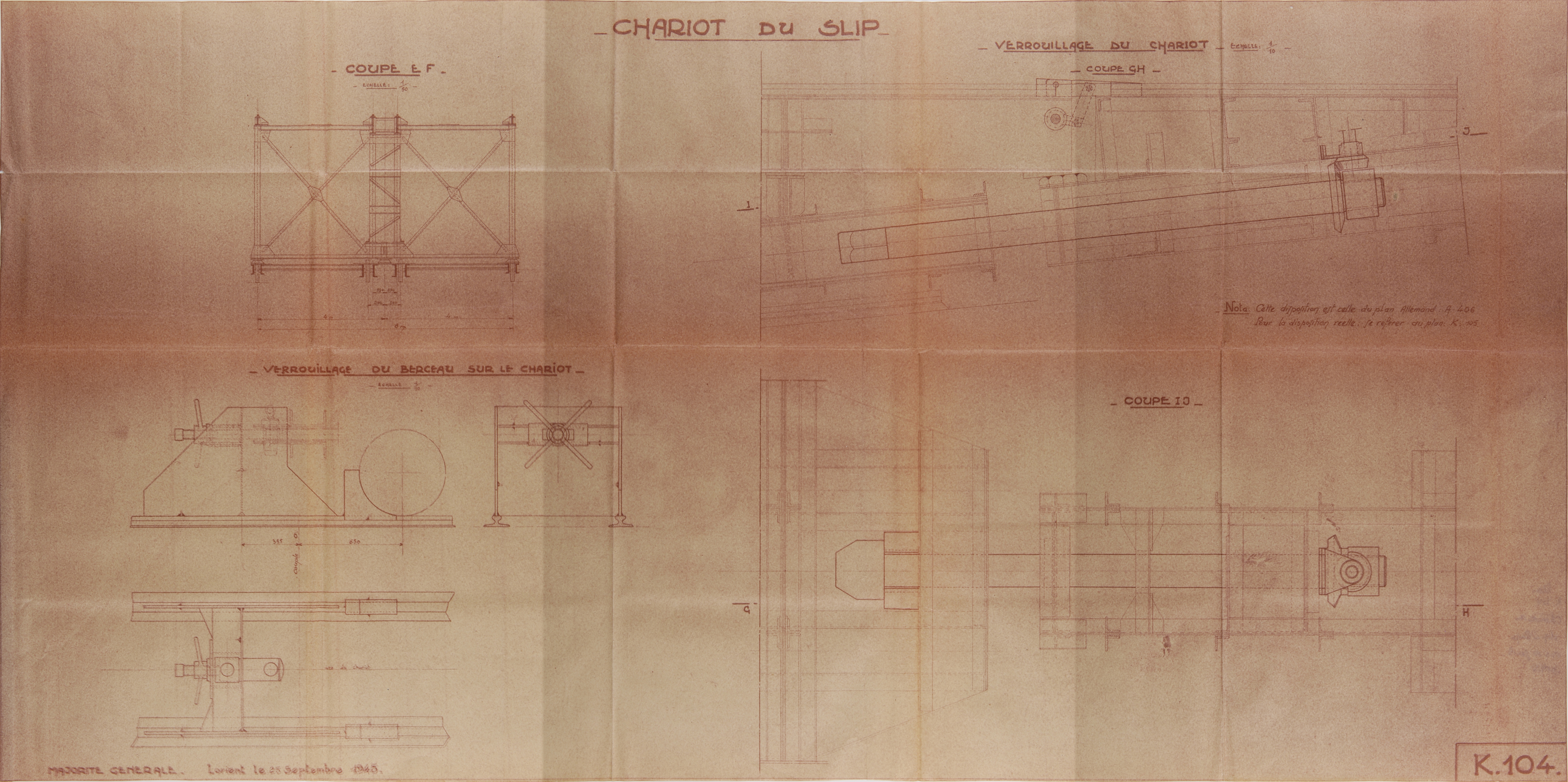 Coupes et élévations du chariot du slipway : système de verrouillage, plan K n° 104, 25 septembre 1945 (Service Historique de la Défense de Lorient, Monographie de la base "Ingénieur Général Stosskopf", 1945-1946)Immatriculation