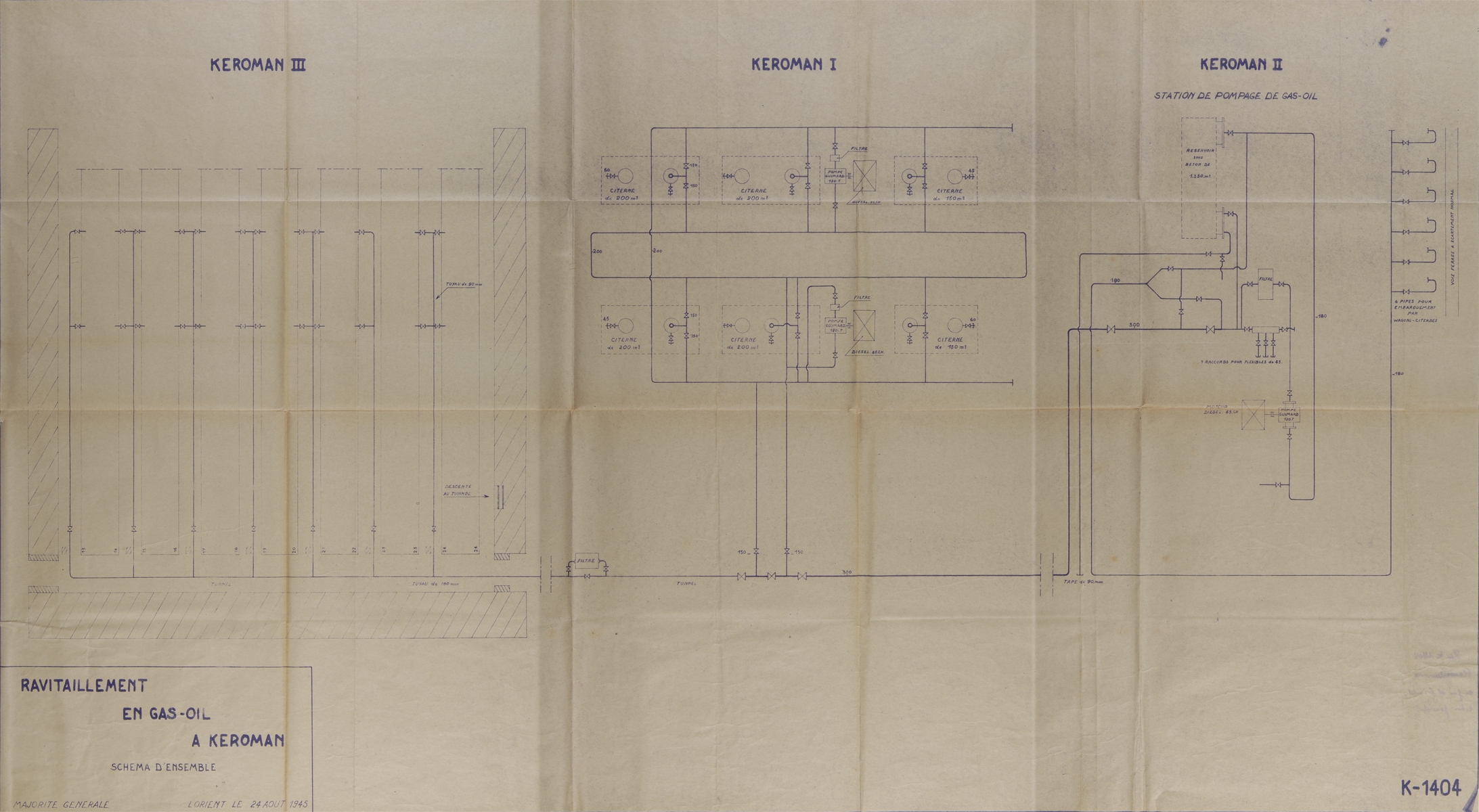 Schéma d'ensemble du circuit de ravitaillement en gas-oil de Keroman, plan K n° 1404, 24 août 1945 (Service Historique de la Défense de Lorient, Monographie de la base "Ingénieur Général Stosskopf", 1945-1946)Immatriculation