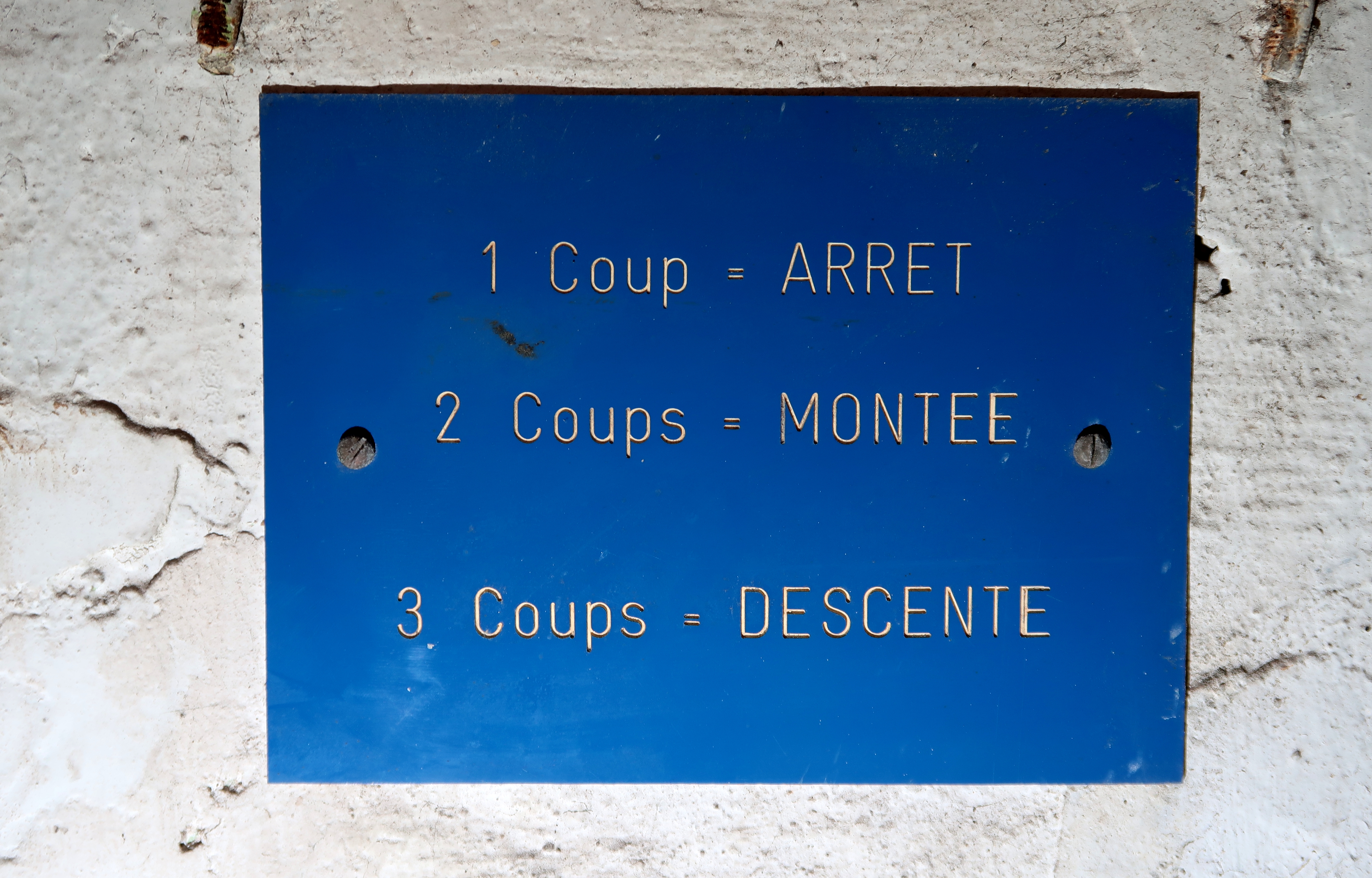 Vue de la signalétique présente entre les deux portes coulissantes d'accès : 1 Coup = ARRET ; 2 Coups = MONTEE ; 3 Coups = DESCENTEImmatriculation