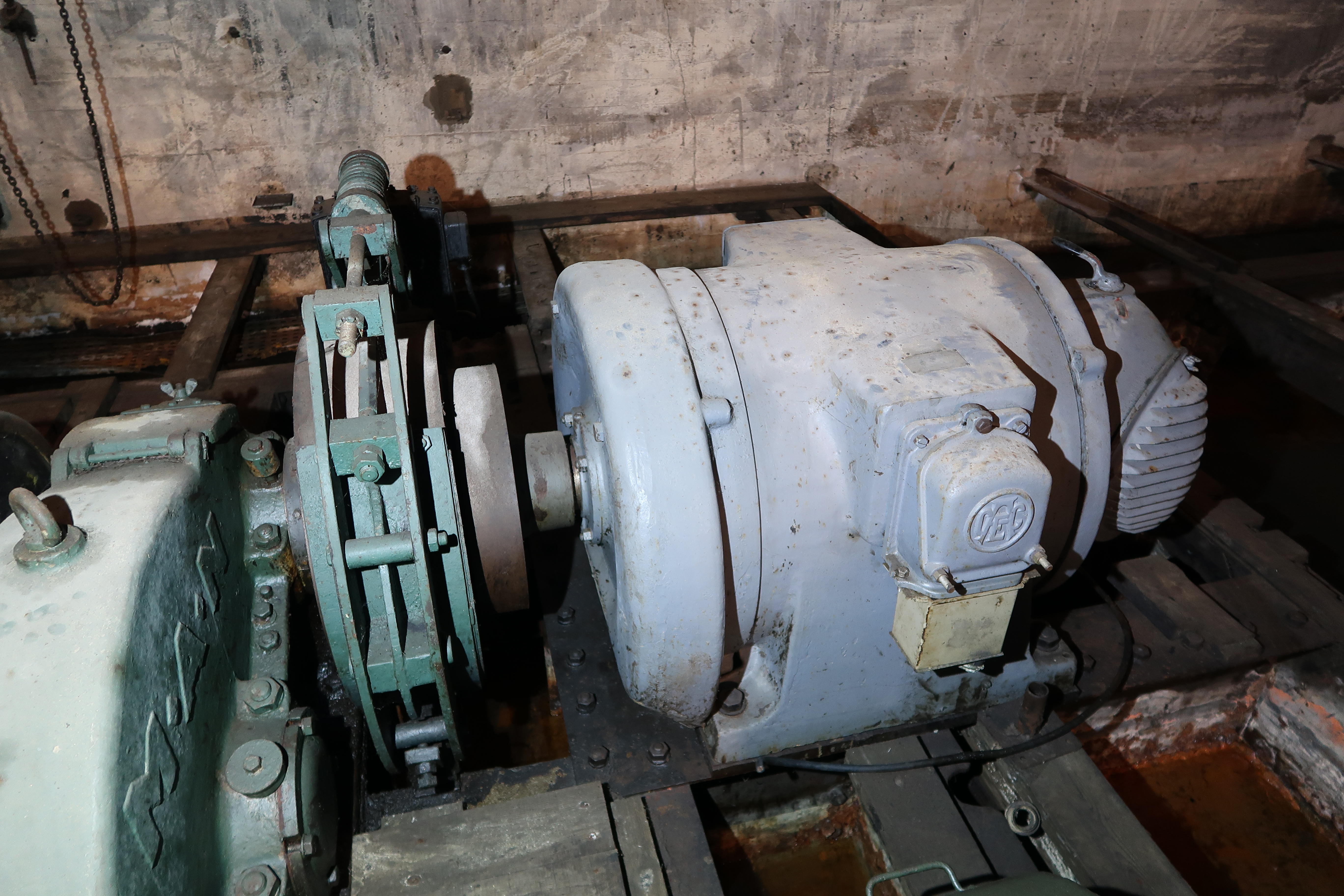 Vue du moteur électrique et du système d'accouplement et de frein à lame dit à tambour de l’arbre moteur. On reconnaît le logo ACEC des Ateliers de constructions électriques de CharleroiImmatriculation