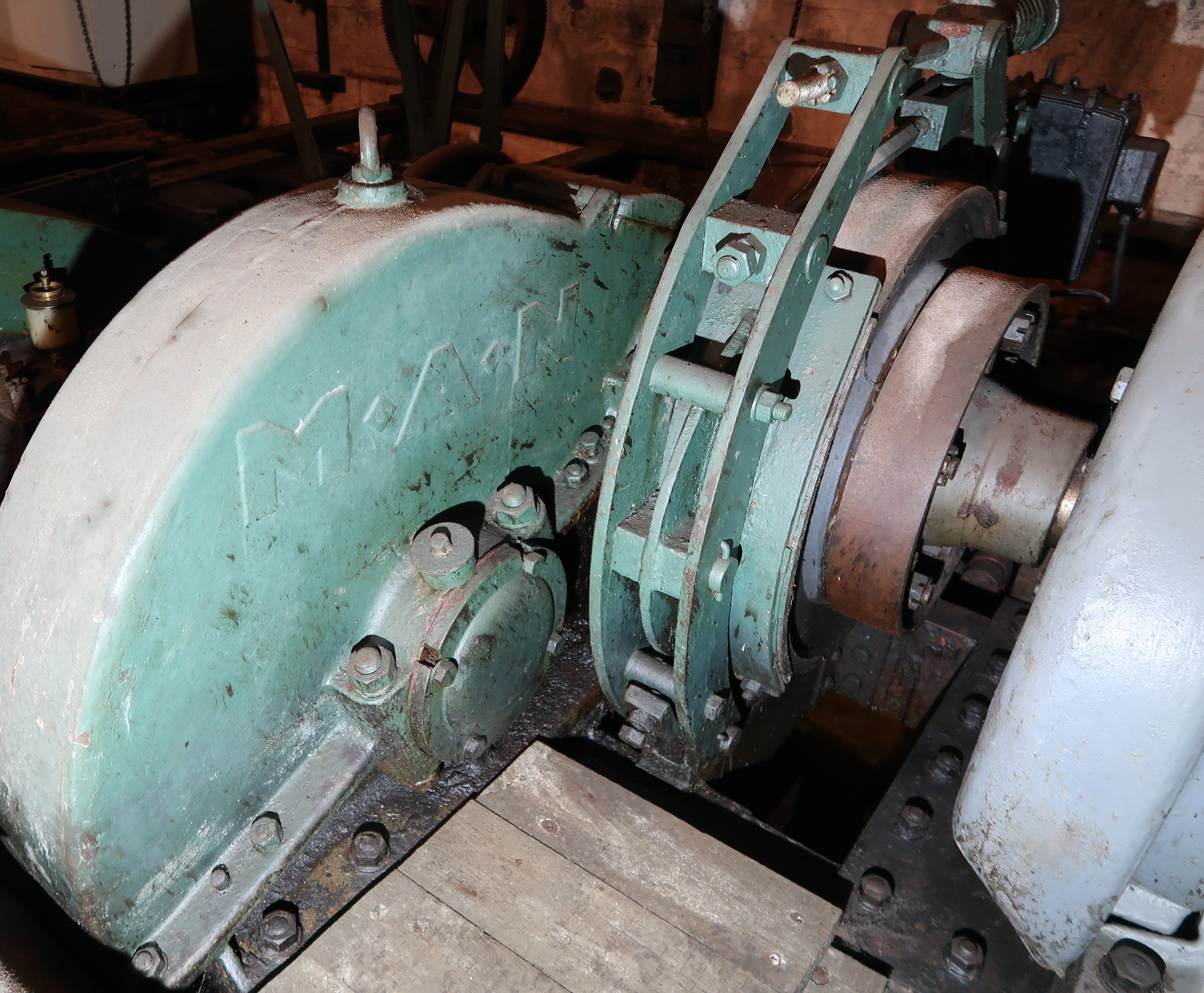Vue du système d'accouplement et de frein à lame dit à tambour de l’arbre moteur. Sur le carter de protection du pignon et de la roue, on reconnaît l'acronyme M.A.N. de la marque allemande Maschinenfabrik Augsburg-NürnbergImmatriculation
