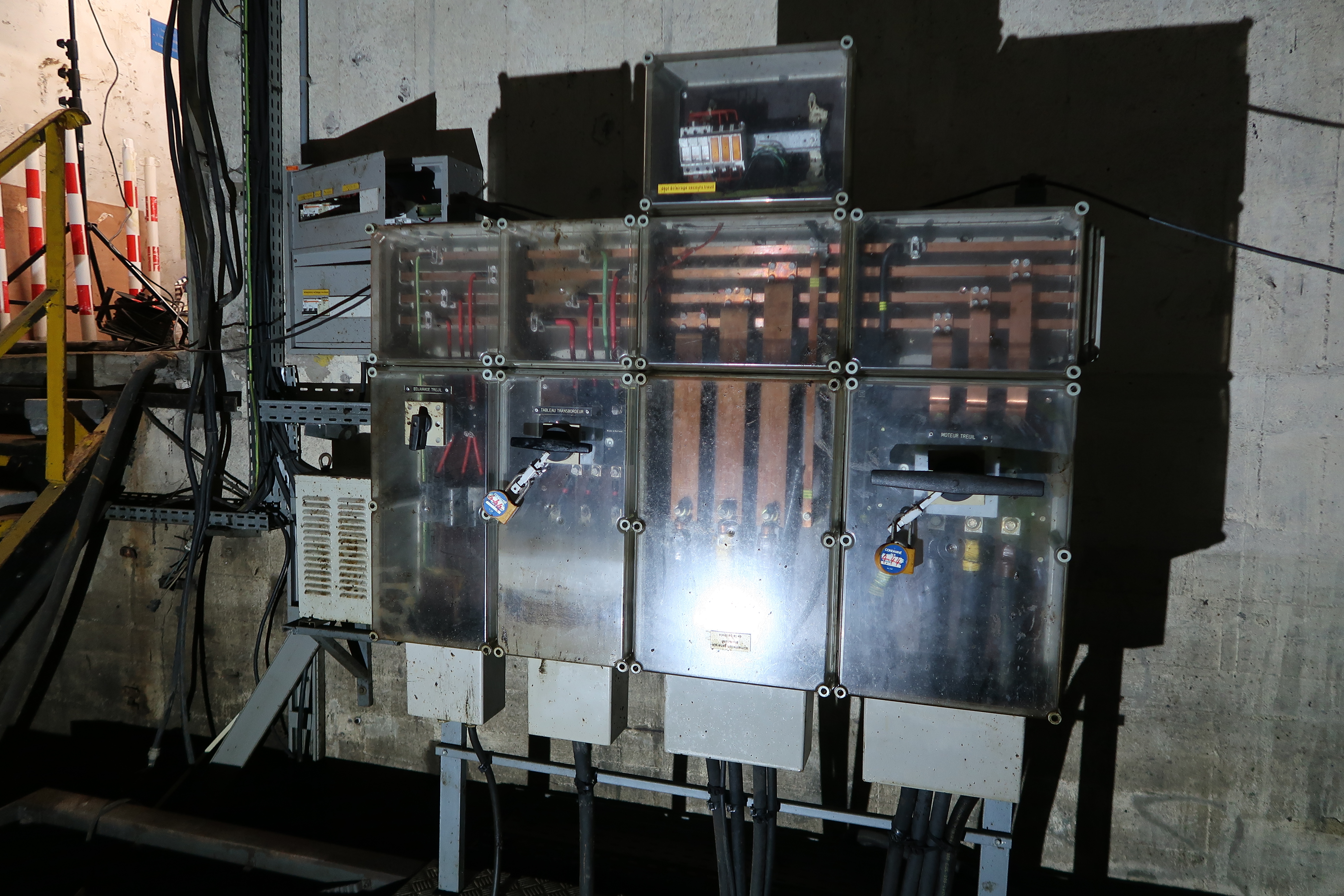 Vue des armoires électriques (n° 2). On peut lire : ECLAIRAGE TREUIL, TABLEAU TRANSBORDEUR, Alimentation générale provenantde la centrale, MOTEUR TREUIL...Immatriculation