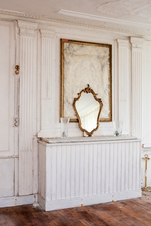 Logis 1758. Salon. Cheminée, boiseries ornées de pilastres cannelés, corniche de plafond.Immatriculation