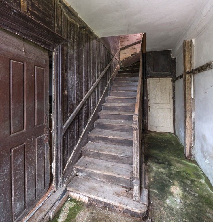 Logis 1713. Vestibule d'entrée avec l'escalier, la porte donnant sur le cellier et le couloir de distributionImmatriculation