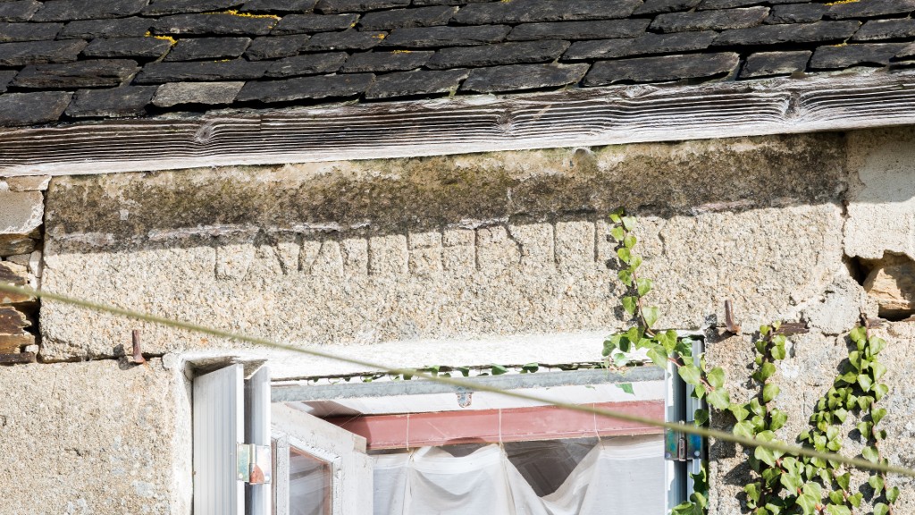 Logis 1713. Détail d'un linteau de fenêtre avec l'inscription : "LAN IHS 1713"Immatriculation