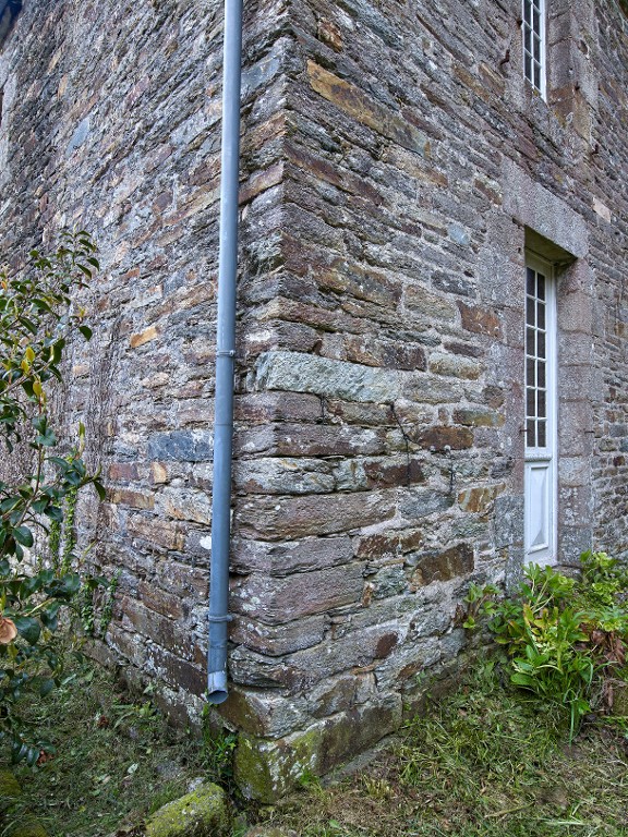 Maison. Détail de la mise en oeuvre de l'angle sans chaîne en pierre de tailleImmatriculation