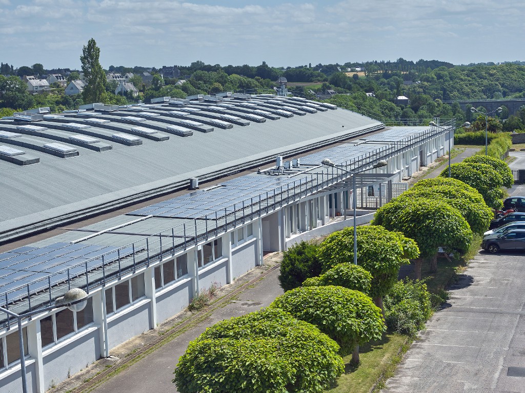 Toiture et façade ouest des ateliers. A l'arrière plan le viaduc routier qui franchit la Rance à hauteur du port de Dinan.Immatriculation
