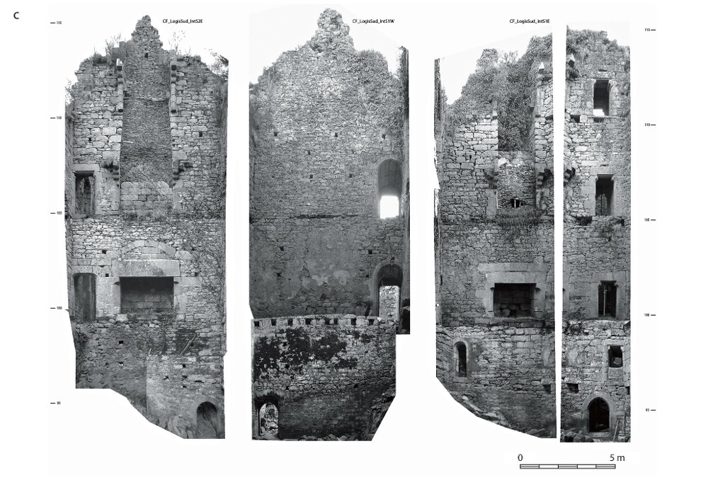 Orthophotographies des élévations du mur de refend et du pignon oriental du grand logis publiées dans l'article de Laurent Beuchet et Elen Esnault, 2020 (Institut national de recherches archéologiques préventives, document Frédéric Boumier)Immatriculation