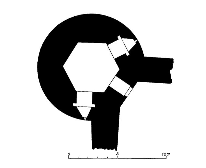 Plan du sous-sol de la tour d'angle orientale avec ses deux canonnières et sa porte d'accès (dessin : Alfred de La Barre de Nanteuil, 1912)Immatriculation